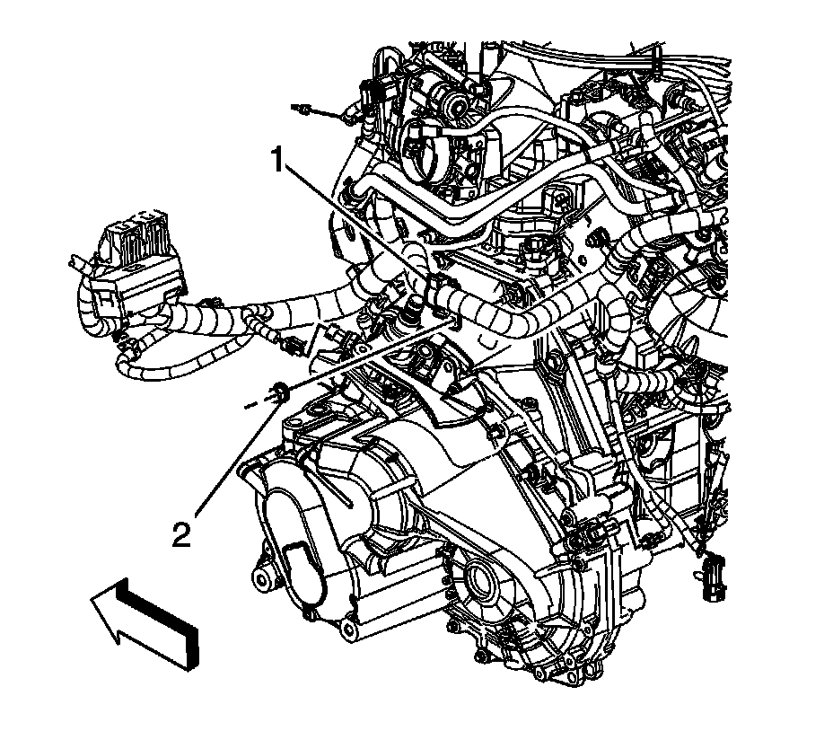 37. Remove the engine harness rear clip (1) from the transmission stud.