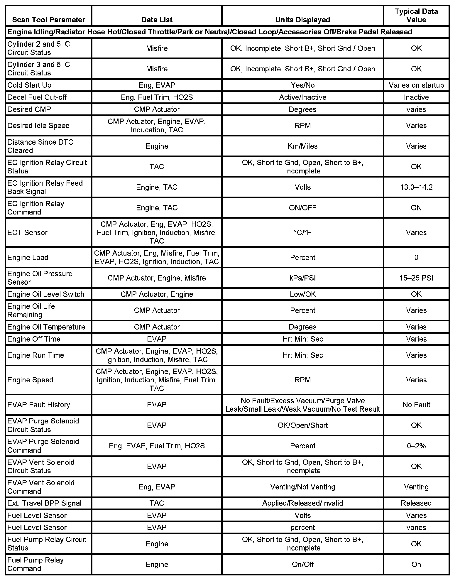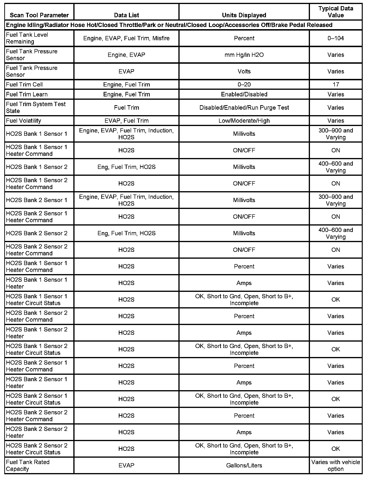 The scan tool values from a properly running engine may be used for comparison with the engine you are diagnosing. The Engine Scan Tool Data List represents values that would be seen on a normally running engine.
