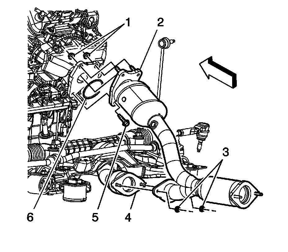 15. Remove the right (rear) catalytic converter bolt (5) and nuts (1) at the exhaust manifold.