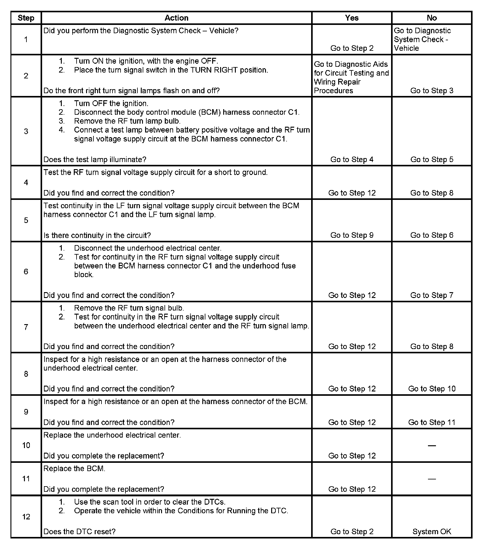 Ground is applied to the turn signal switch. When the turn signal switch is placed in the turn right position, ground is applied to the body control module (BCM) through the right turn signal switch circuit. The BCM applies a pulsating voltage to the RF and RR turn signal lamps through the RF and RR turn signal voltage supply circuits.