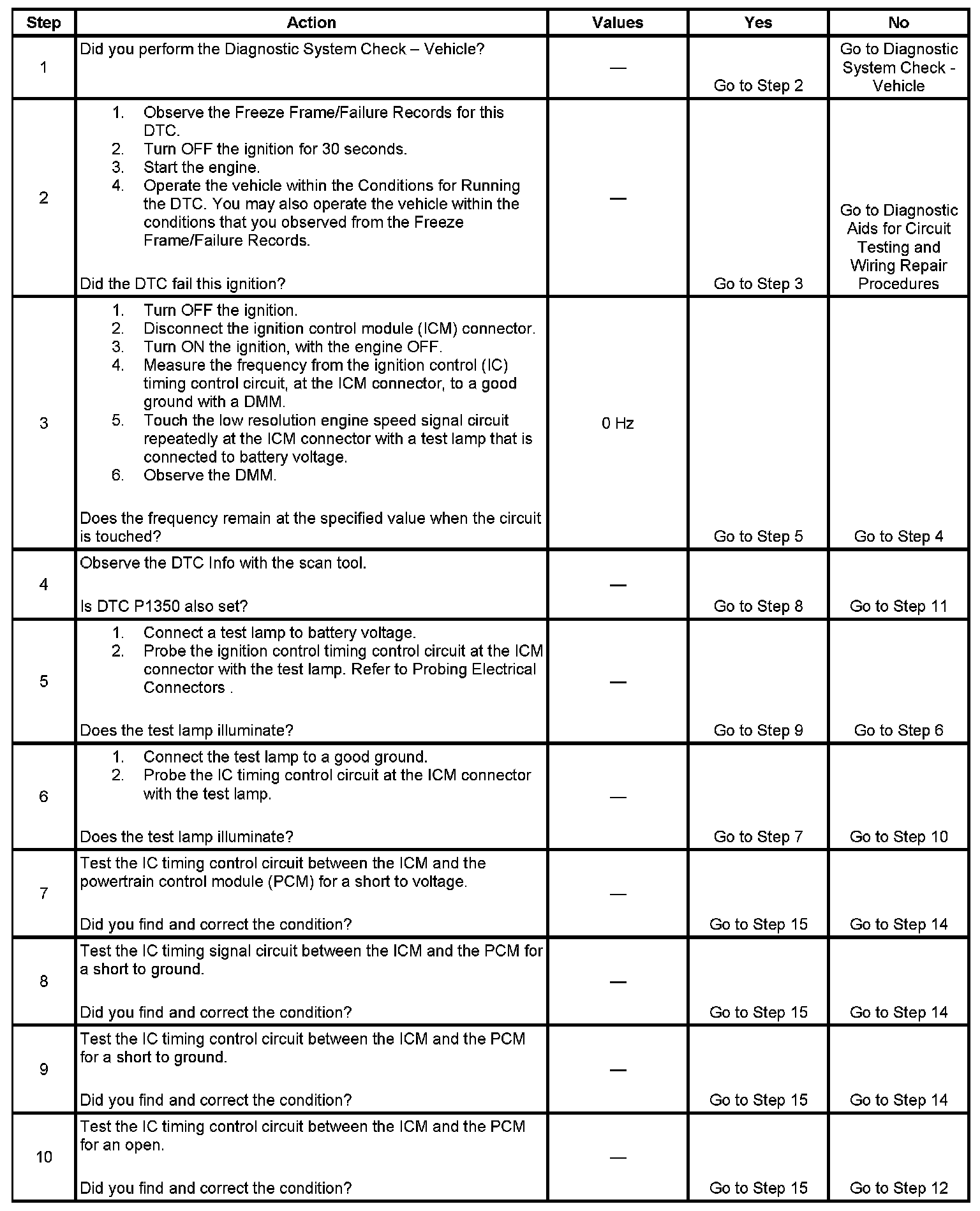 The PCM sends spark timing signals to the ICM on the IC timing control circuit, but during cranking the ICM grounds these signals. When the PCM begins receiving the 3X reference pulses from the ICM and the engine starts, the PCM applies 5 volts to the IC timing signal circuit allowing the ICM to switch to the IC mode of operation and respond to the spark timing signals from the PCM. The PCM monitors the IC timing control circuit for errors. If the PCM detects a fault, DTC P0350 sets.
