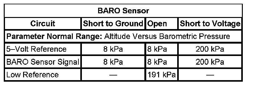 The barometric pressure (BARO) sensor measures the pressure of the atmosphere. This pressure is affected by altitude and weather conditions. A diaphragm within the BARO sensor is displaced by the pressure changes that occur from varying altitudes and weather conditions. The sensor translates this action into electrical resistance. The BARO sensor wiring includes 3 circuits. The BARO sensor and all related circuits are inside the engine control module (ECM). The BARO sensor provides a signal voltage to the ECM, relative to the pressure changes on the BARO sensor signal circuit. The ECM converts the signal voltage input to a pressure value. Changes in BARO due to weather are relatively small, while changes due to altitude are significant. Pressure can range from 56 kPa at an altitude of 4,267 meters (14,000 feet), to 105 kPa at or below sea level. The BARO sensor has a range of 8-200 kPa. The ECM uses the BARO sensor input for fuel delivery and other diagnostics.