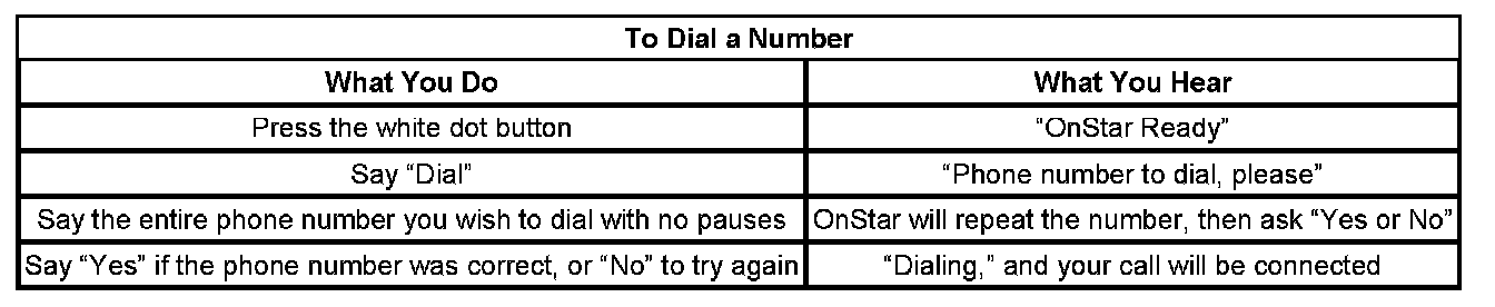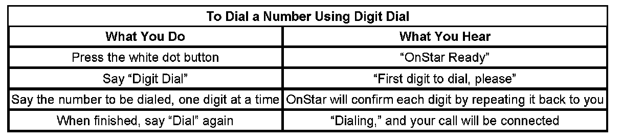 After 3 unsuccessful tries, or if you simply like it better, you can use the "Digit Dial" command to input digits one at a time. Digit Dial is set up to dial phone numbers like previous OnStar Personal Calling Systems.