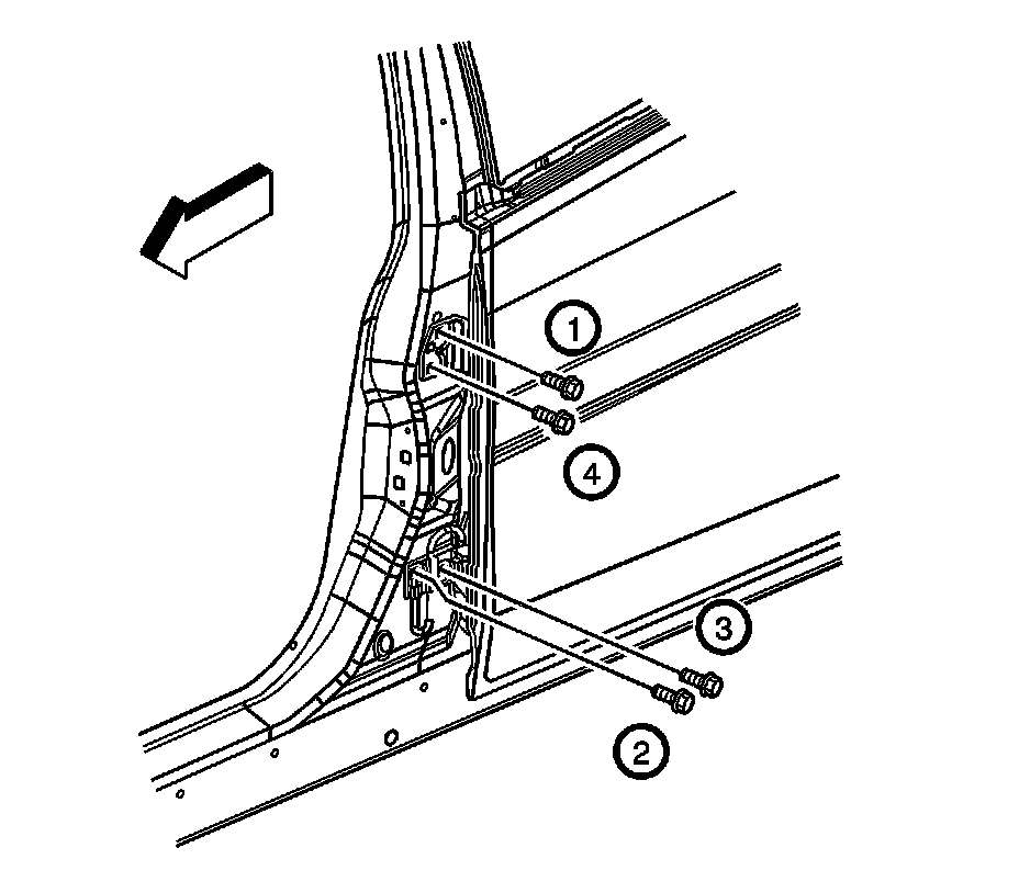 1. Install the hinge pillar side bolts in the specified sequence (1, 2, 3, 4) to 33 N.m (24 lb ft).