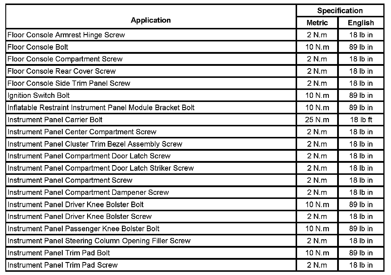 Instrument Panel and Console Trim - Fastener Tightening Specifications