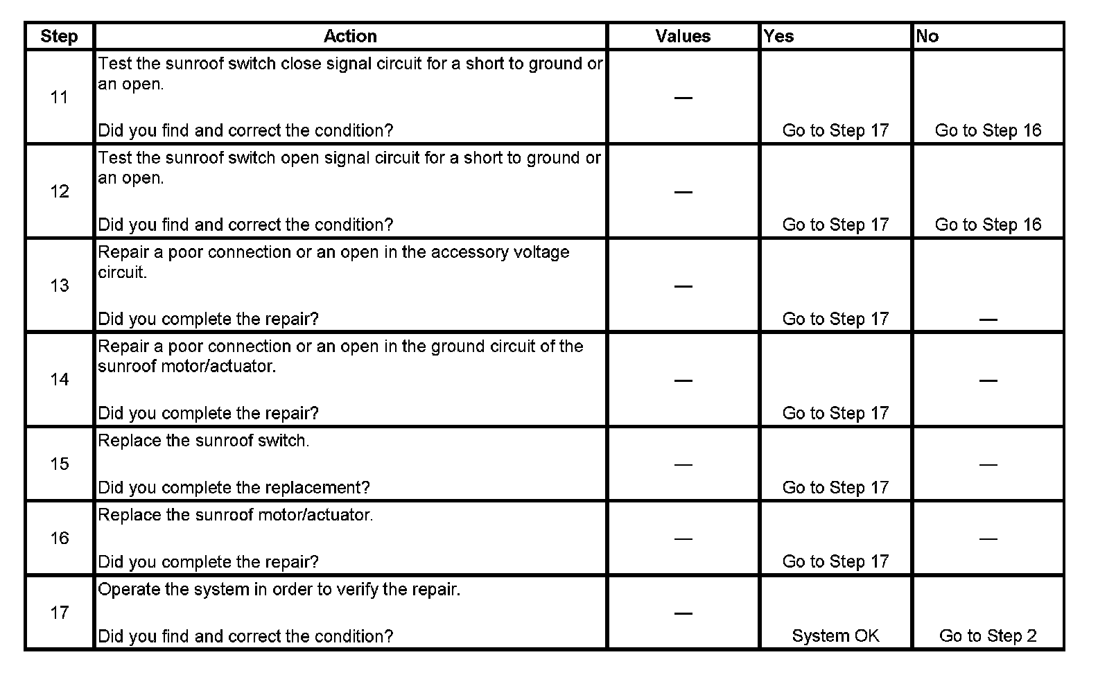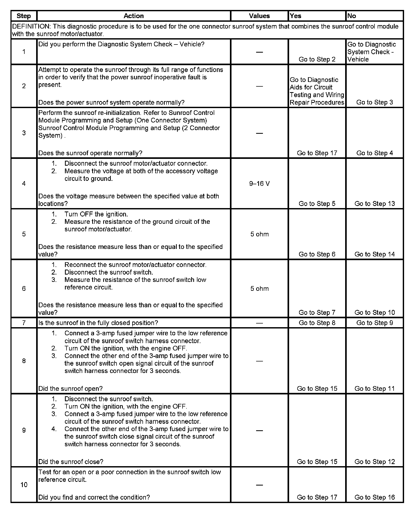 If voltage is not measured on the sunroof switch open signal or sunroof switch close signal circuits, the fault could be in the accessory voltage circuit, battery positive voltage circuit, or sunroof motor/module ground circuit. If the sunroof motor/module is not being powered, neither will the sunroof switch signal circuits.