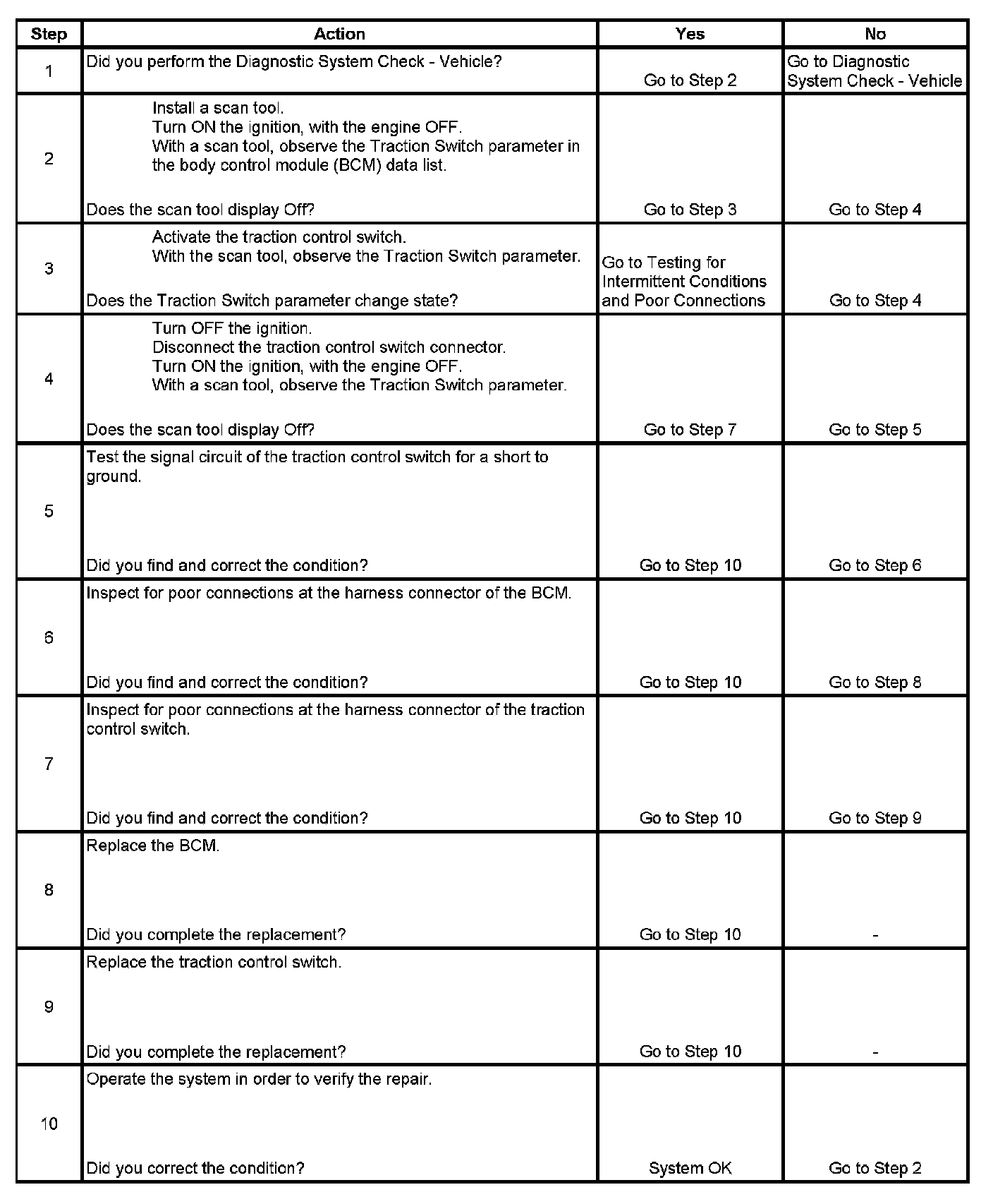 The TRAC OFF indicator is controlled by the instrument cluster via class 2 serial data messages from the electronic brake control module (EBCM). When the body control module (BCM) sees the traction control switch input grounded through the momentary traction control switch, it sends a class 2 message to the EBCM that tells the EBCM that the traction control switch has been pressed. The EBCM then disables traction control and sends a message to the instrument cluster to turn the TRAC OFF indicator ON. Each time the ignition is cycled from OFF to ON, the traction control system is enabled.