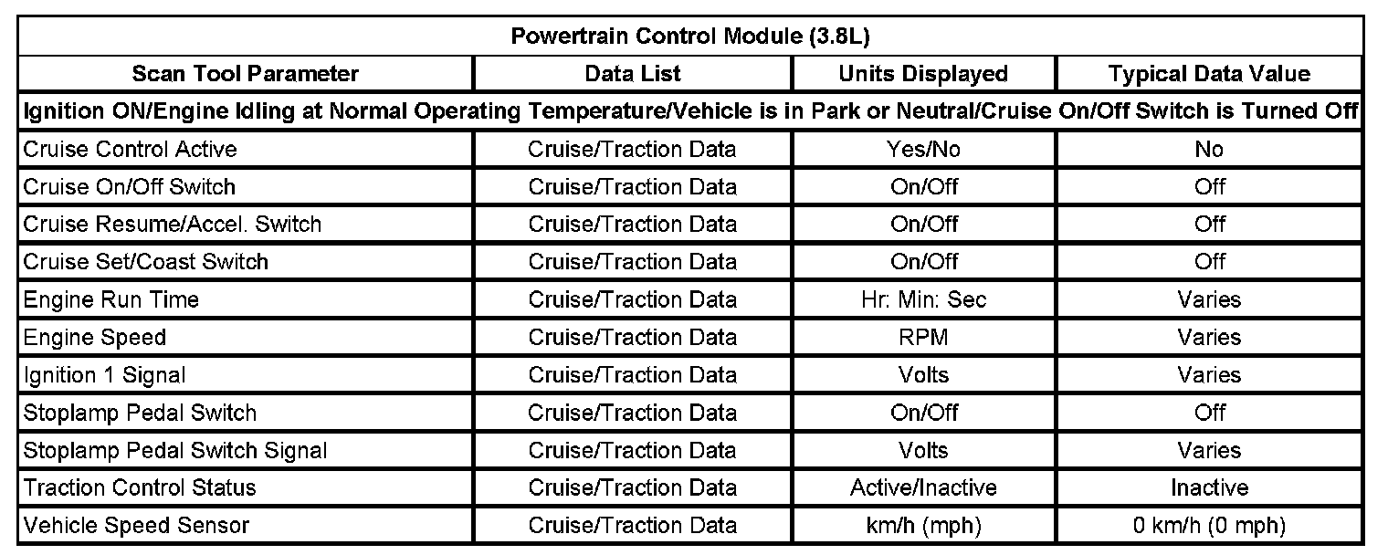 The scan tool data lists contain all of the cruise control related parameters that are available on the scan tool. The parameters in the list are arranged in alphabetical order. The data list column indicates the location of the parameter within the scan tool menu selections.
