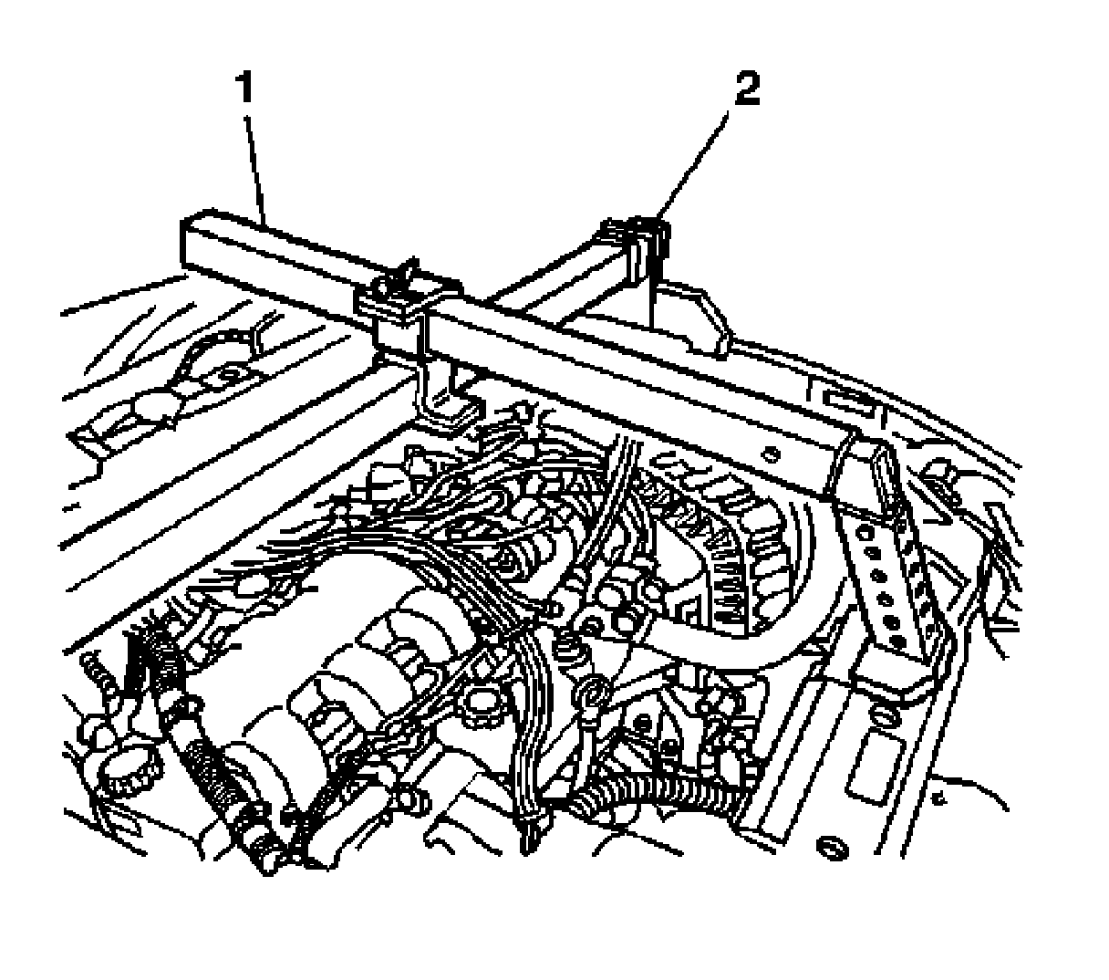 4. Install the J 28467-B (1) and the J-28467-501 (2) to the fender rails.