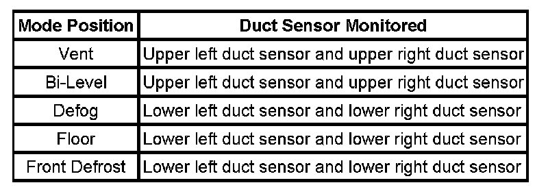 The upper and lower duct sensors are divided into left and right zone operation. The left side upper and lower duct sensors will only effect the operation of the left air temperature actuator and the right side upper and lower duct sensors will only effect the operation of the right air temperature actuator. The duct sensors are used to measure the temperature of the air exiting the ducts. The sensors operate within a temperature range between -6.5 to +57.5°C (+20.3 to +135.5°F). When temperature increases the sensor signal decreases. The HVAC control module converts the 0-5 volt sensor signal to a range between 0-255 counts. If the HVAC control module detects that one of the duct temperatures must change, the HVAC control module will adjust the appropriate air temperature actuator. The following list shows the duct sensors that are monitored by the HVAC control module in each mode position: