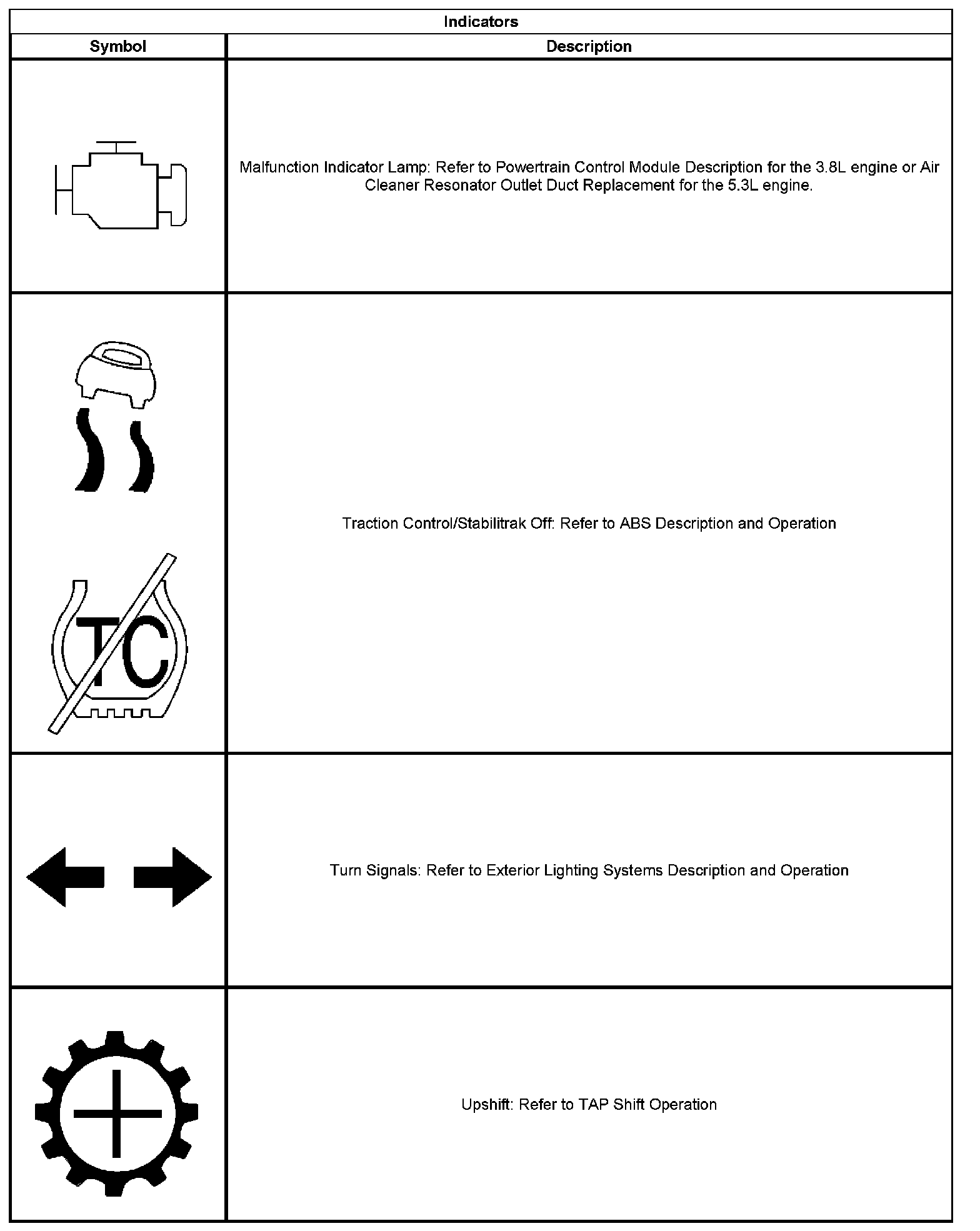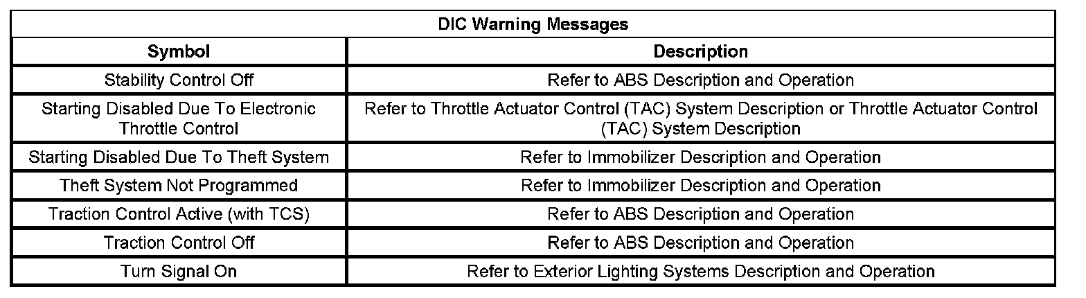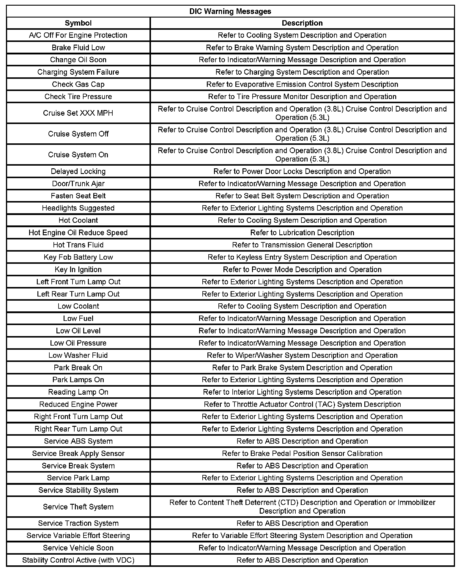 The driver information center (DIC) illuminates the SERVICE VEHICLE SOON indicator when the powertrain control module (PCM) or the engine control module (ECM) detects certain malfunctions that are not related to the emissions system. The DIC receives a class 2 message requesting illumination from the PCM/ECM.