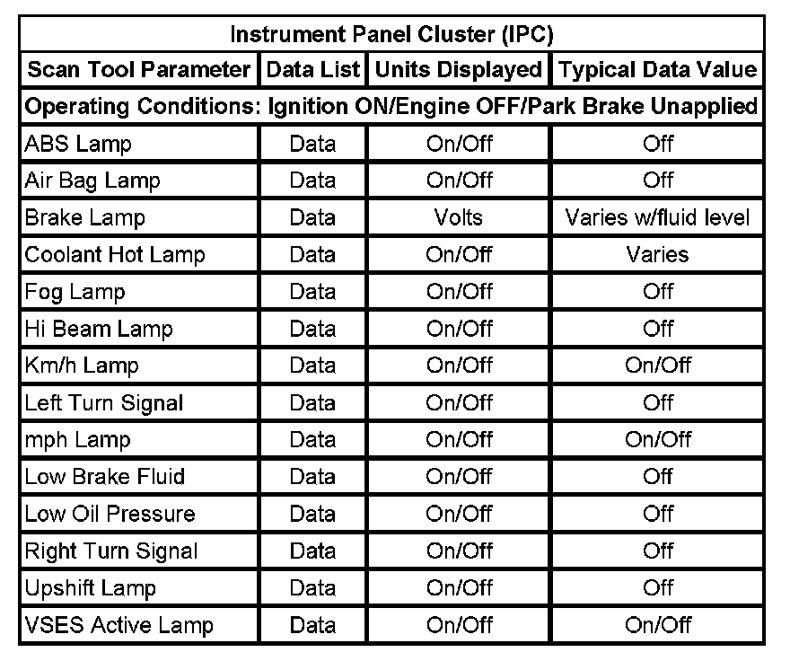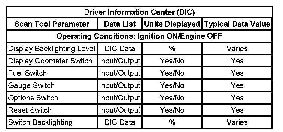 The scan tool data lists contain all the instrument panel, gage, and console related parameters that are available on the scan tool. The parameters in the list are arranged in alphabetical order. The data list column indicates the location of the parameter within the scan tool menu selections.