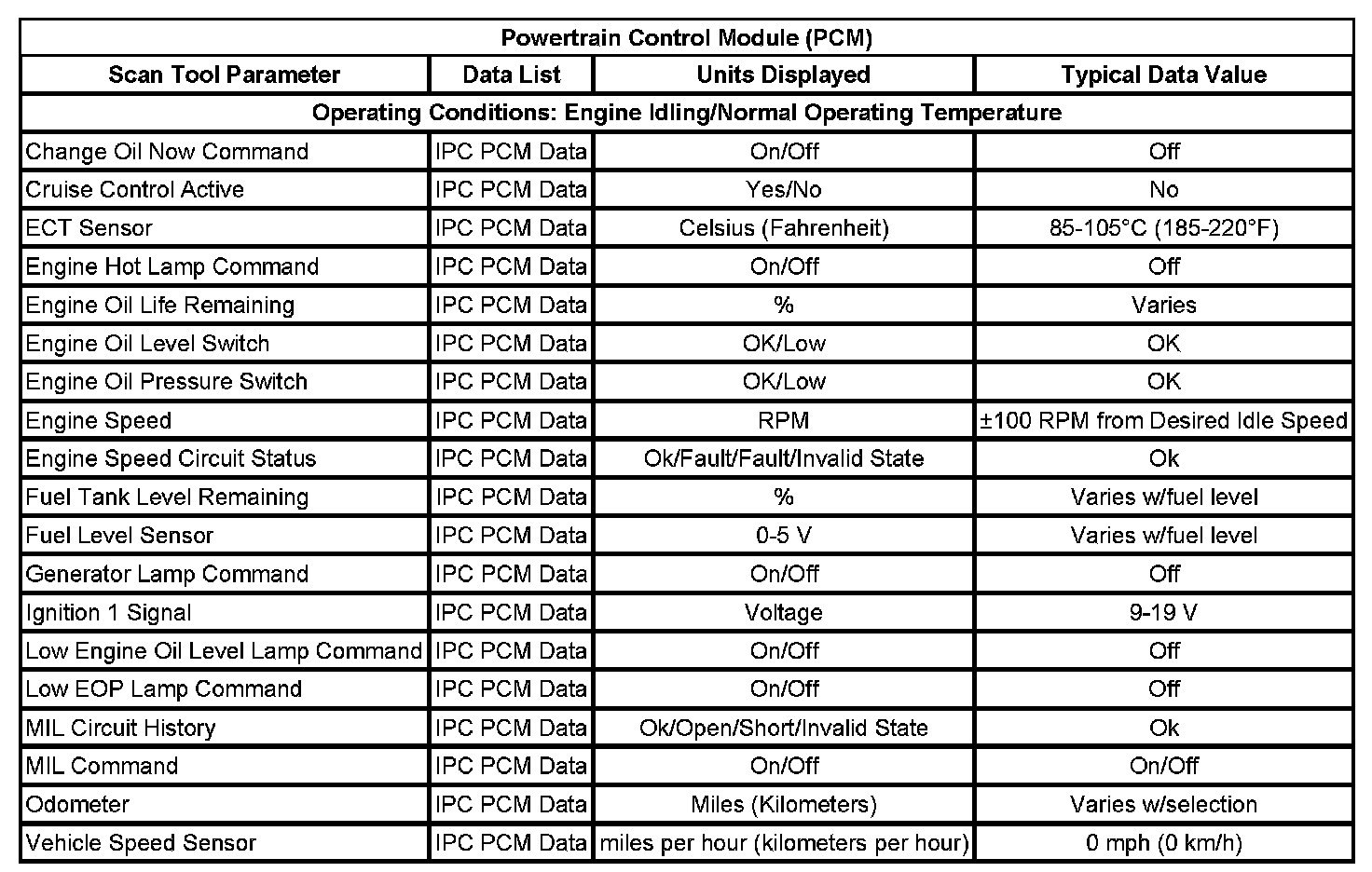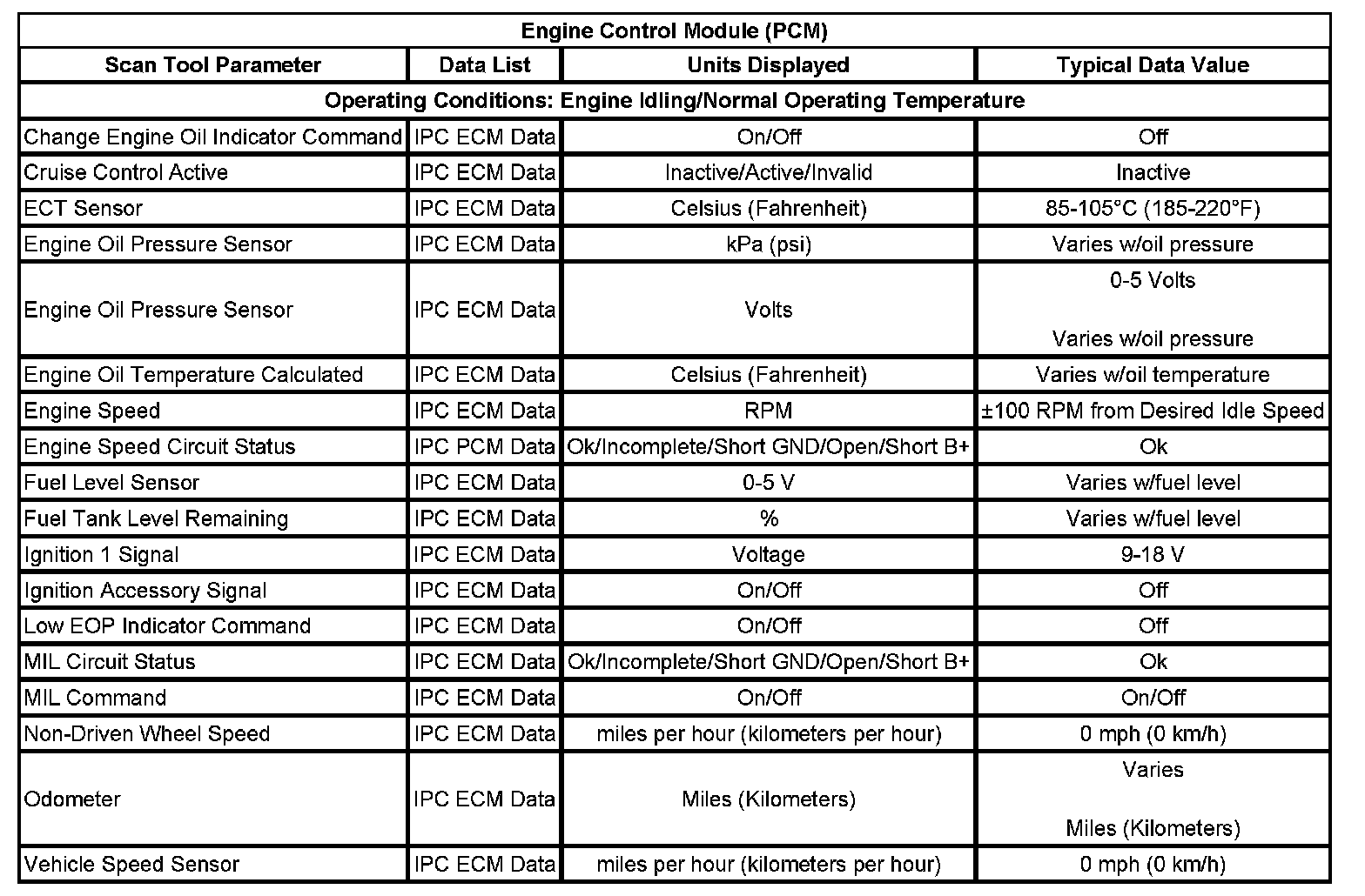 The typical data values are obtained from a properly operating vehicle under the conditions specified in the first row of the scan tool data list table. Comparison of the parameter values from the suspect vehicle with the typical data values may reveal the source of the customer concern.