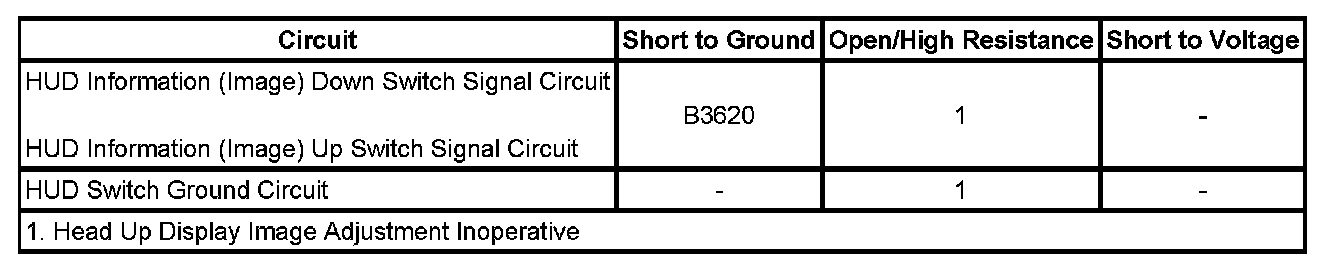 The head-up display (HUD) information (image) down or information (image) up switch is used to vertically adjust the HUD image on the windshield to accommodate various vehicle operator heights. The HUD monitors the image down or image up switch signal circuit in order to adjust image positions. When the HUD information down or information up switch is depressed and the ignition is in the RUN position, the switch signal to the HUD is low.