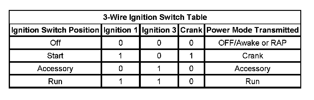 On vehicles that have several control modules connected by serial data circuits, one module is the power mode master (PMM). On this vehicle, the PMM is the body control module (BCM). The PMM receives 3 discrete ignition switch signals to differentiate which power mode will be sent over the Serial Data circuits. The table below illustrates the state of these inputs in correspondence to the ignition switch position: