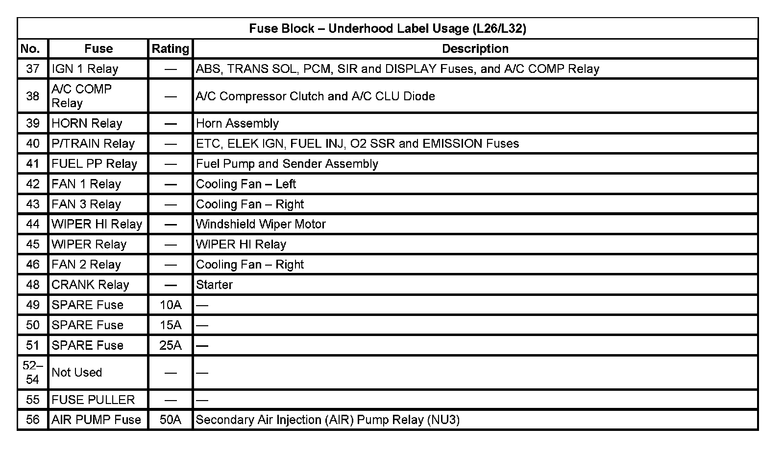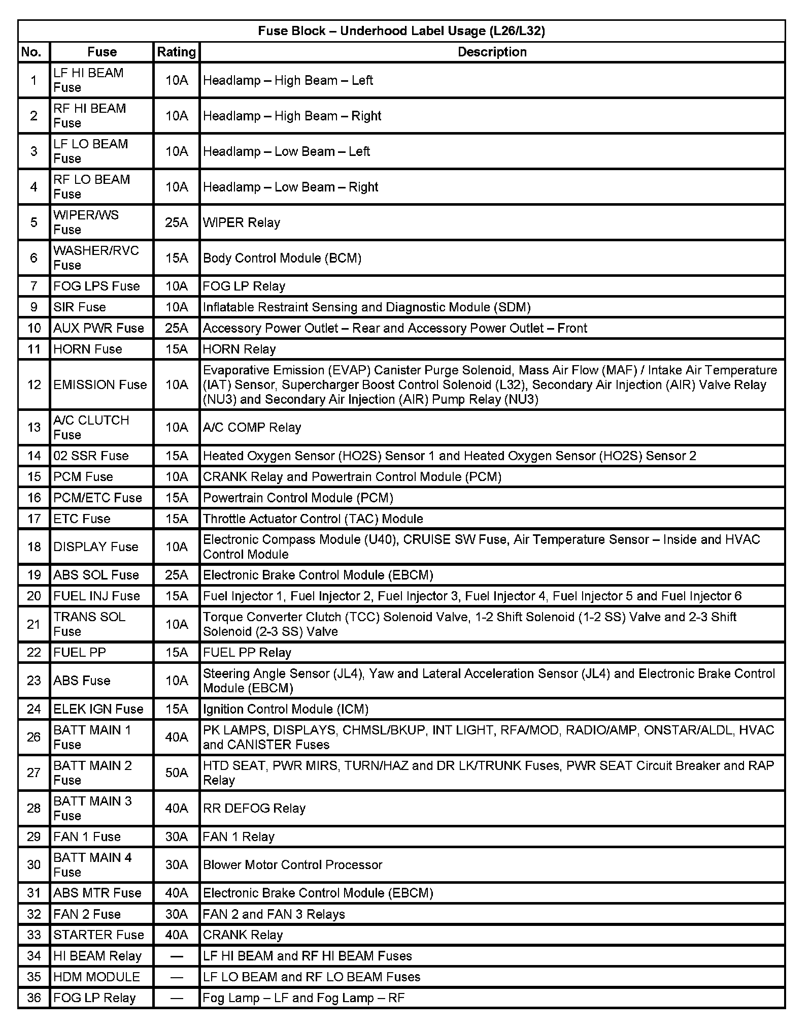 Fuse Block - Underhood Label Usage (With RPO Code L26/L32):