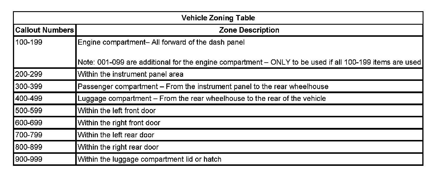 All grounds, in-line connectors, pass-through grommets, and splices have identifying numbers that correspond to where they are located in the vehicle. The table explains the numbering system.