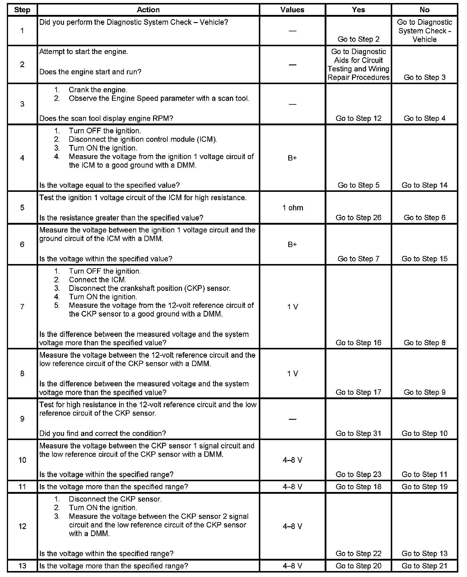 The ignition control module (ICM) monitors the crankshaft position (CKP) sensor sync signal when the engine is cranking. The CKP sync signal is passed from the CKP sensor to the ICM on the CKP sensor 2 signal circuit. The CKP sync signal is used to determine the correct cylinder pair and initiate the ignition coil firing sequence. The 18X reference pulses are passed from the CKP sensor to the ICM on the CKP sensor 1 signal circuit. The 18X reference pulses are used for fuel injection and ignition control. After the ICM receives both signals, the ICM passes the 18X and 3X reference signals to the powertrain control module (PCM). The camshaft position sensor and the CKP sensor share a 12-volt reference and a low reference circuit. The CKP sensor consists of the following circuits: