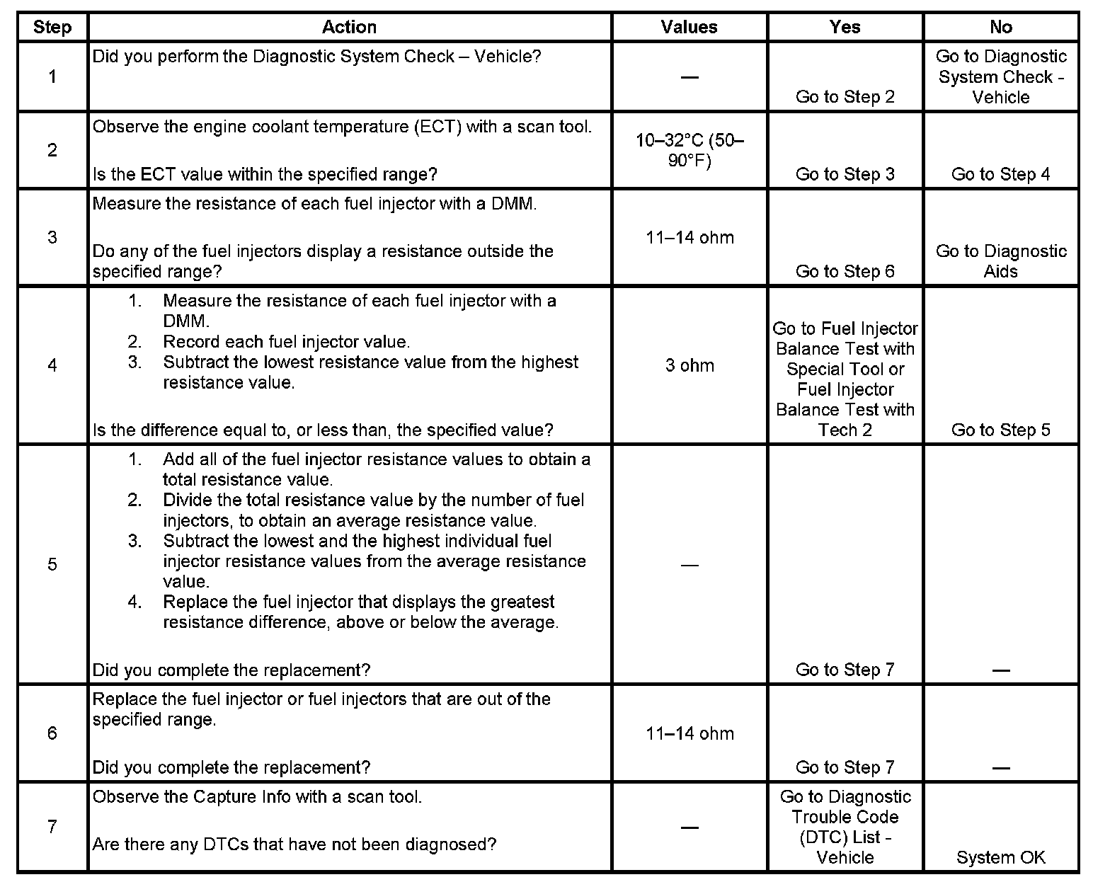 3. This step tests each fuel injector resistance within a specific temperature range. If any of the fuel injectors display a resistance outside of the specified value, replace the fuel injector.