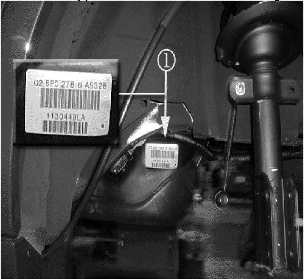 2. Locate the fuel tank serial number (1), which is on the driver's side of the tank and usually visible through the rear driver's side wheel well.