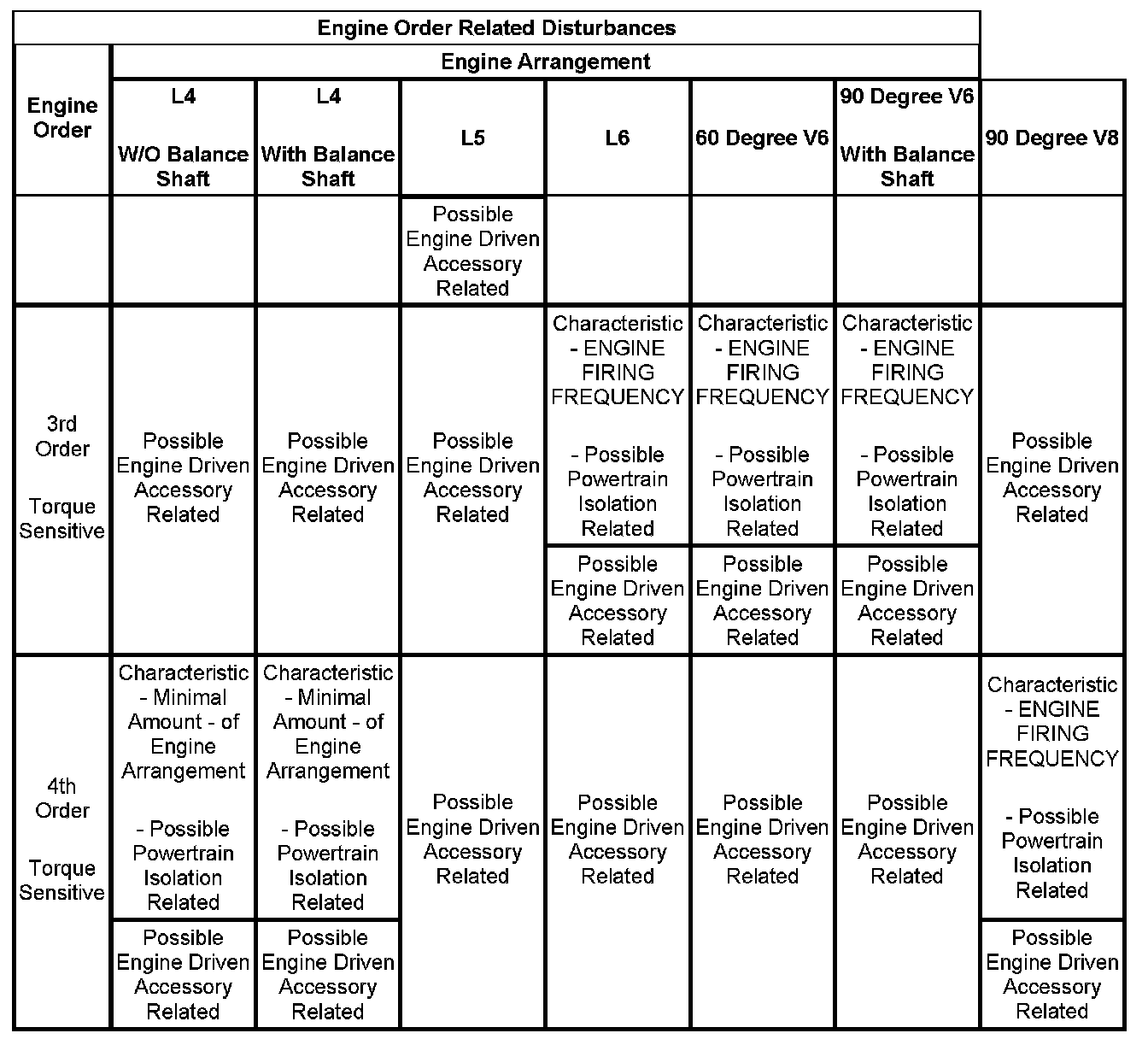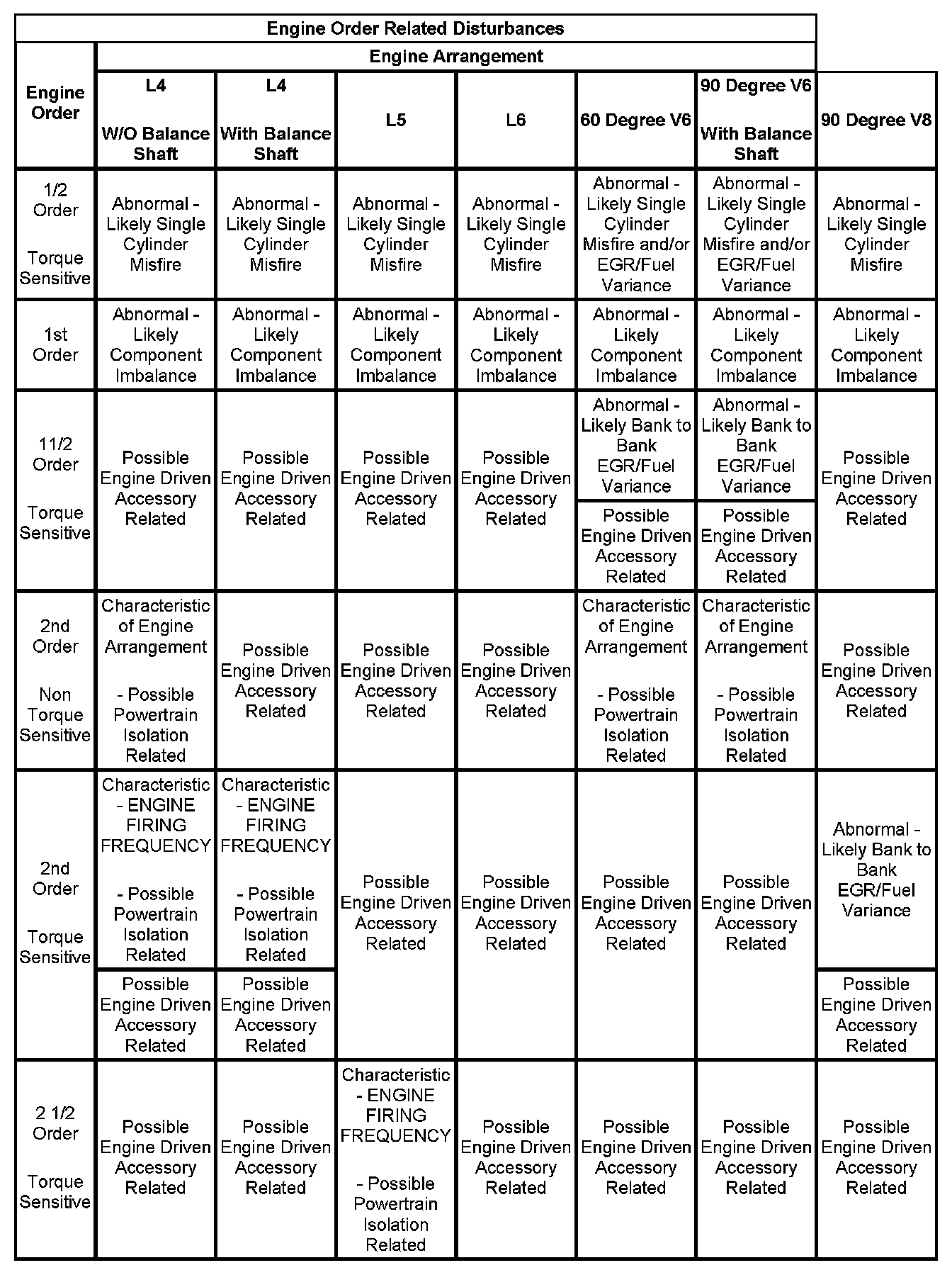 3. If the dominant frequency in Hz, recorded during duplication of the disturbance and the engine firing frequency in Hz, just calculated ARE related, then an engine FIRING FREQUENCY related disturbance is present. Engine firing frequency disturbances are usually related to improper isolation of a component. Refer to the Engine Order Related Disturbances table.