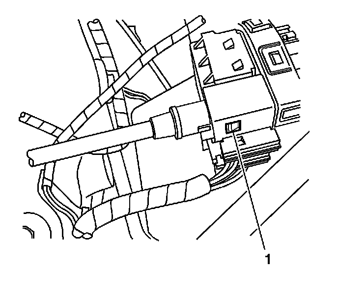 6. Using a screwdriver, release the cable from the ignition switch inhibitor by depressing the cable latch (1).