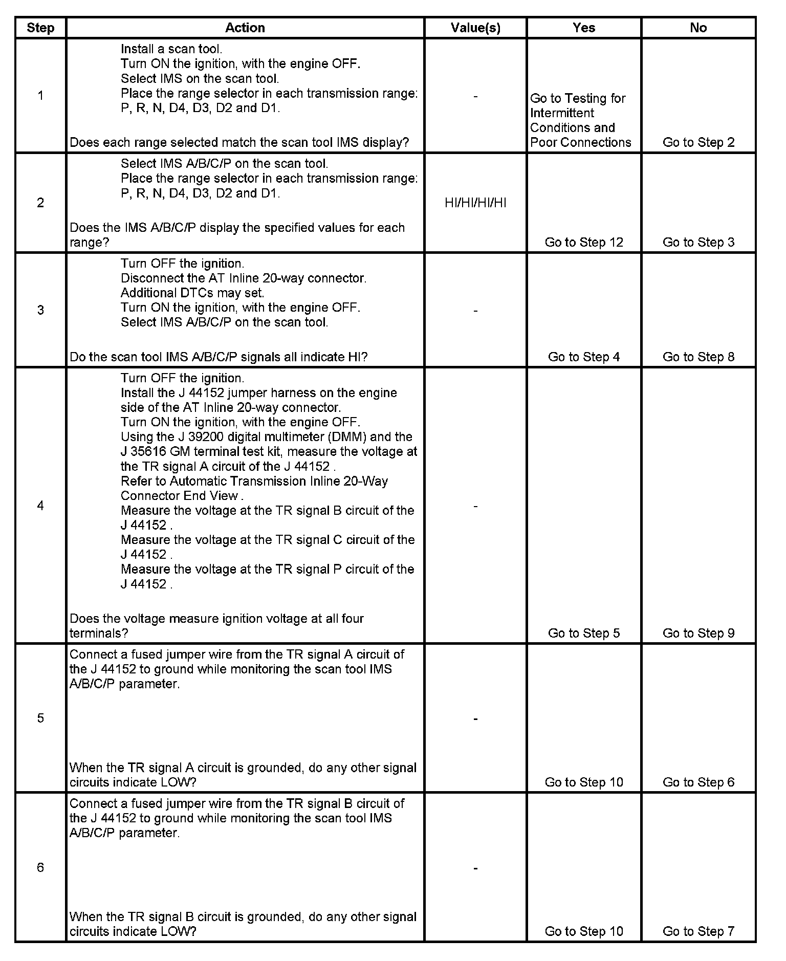 The transmission internal mode switch (IMS) is a sliding contact switch attached to the selector detent inside the transmission side cover. The four inputs to the PCM indicate the position of the transmission range selector. The input voltage level at the PCM is high, B+, when the IMS is open and low when the switch is closed to ground. The four input parameters represented are Signals A, B, C and P, Parity. Refer to Transmission Internal Mode Switch Logic.
