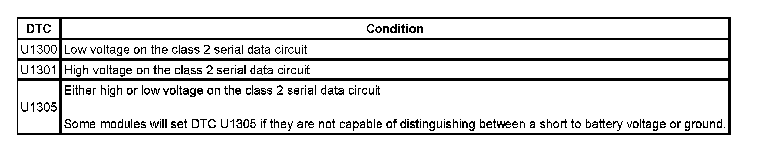 Modules connected to the class 2 serial data circuit monitor for serial data communications during normal vehicle operation. Operating information and commands are exchanged among the modules. In addition to this, Node Alive messages are transmitted by each module on the class 2 serial data circuit about once every 2 seconds. When the module detects one of the following conditions on the class 2 serial data circuit for approximately 3 seconds, the setting of all other class 2 serial communication DTCs is inhibited and a DTC will set.