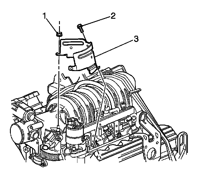 9. Remove the exhaust gas recirculation (EGR) valve wiring harness heat shield nut (1), bolt (2) and the EGR heat shield (3).