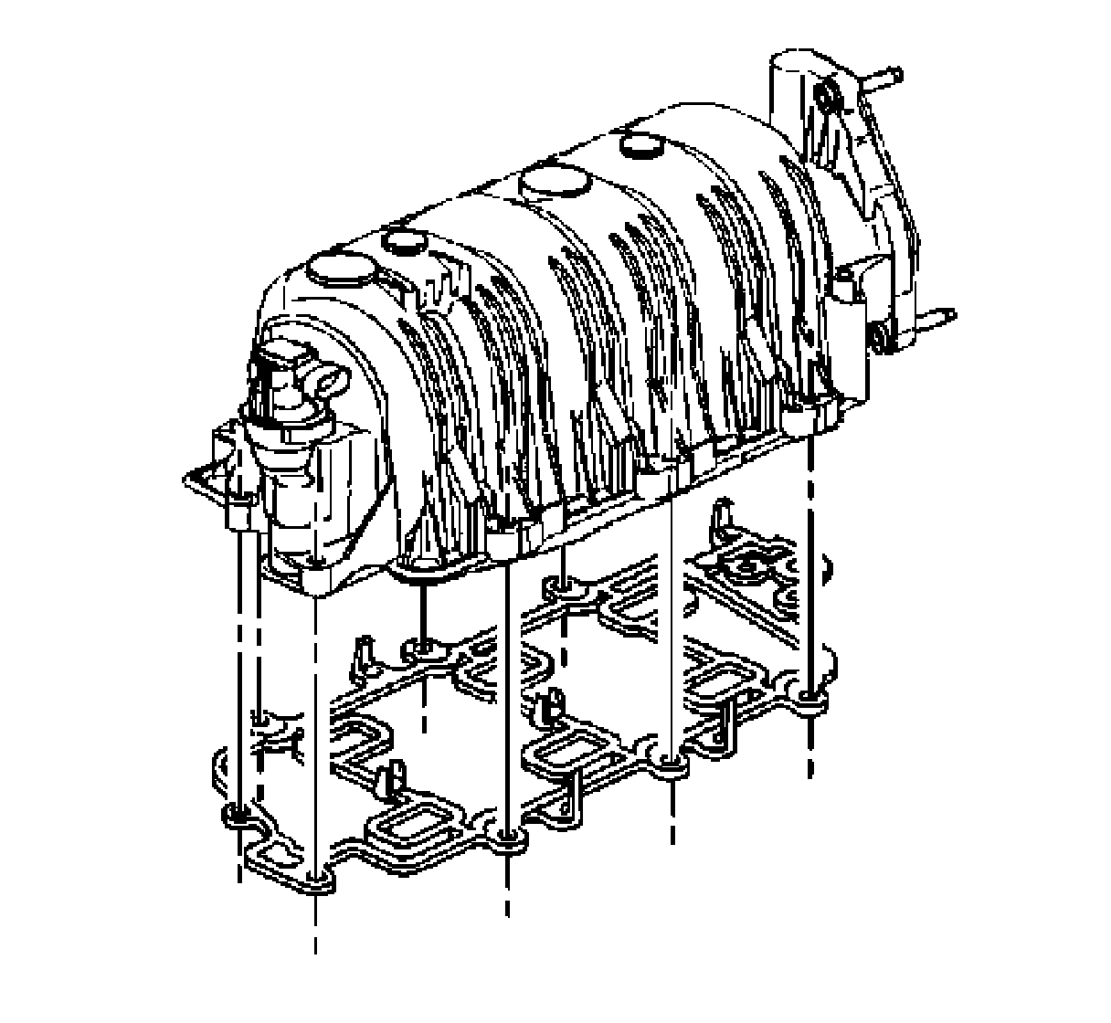 3. Carefully install the upper intake manifold (5) onto the lower intake manifold. Ensure that the alignment pins in the upper intake manifold align with the holes in the lower intake manifold.