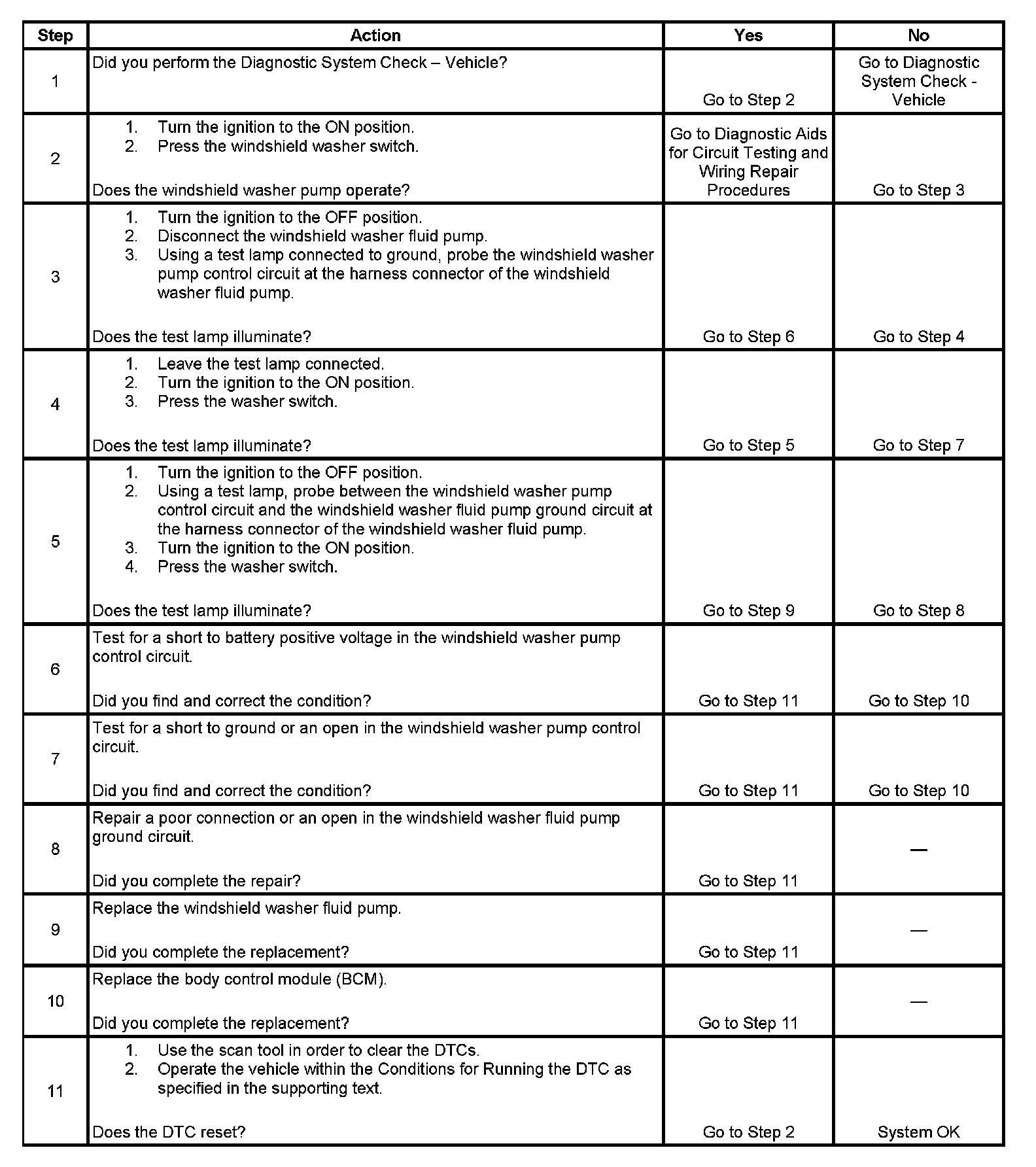The BCM detects a short to ground, an open, or a short to battery positive voltage in the windshield washer pump control circuit.