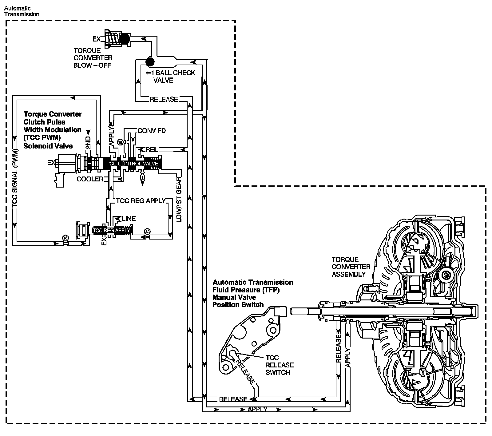 The TCC release switch is a normally-closed switch. When the TCC is released, TCC release fluid pressure opens the TCC release switch which opens the TCC release pressure circuit. When the voltage on the circuit is high, switch open, the transmission control module (TCM) recognizes that the TCC is no longer engaged.