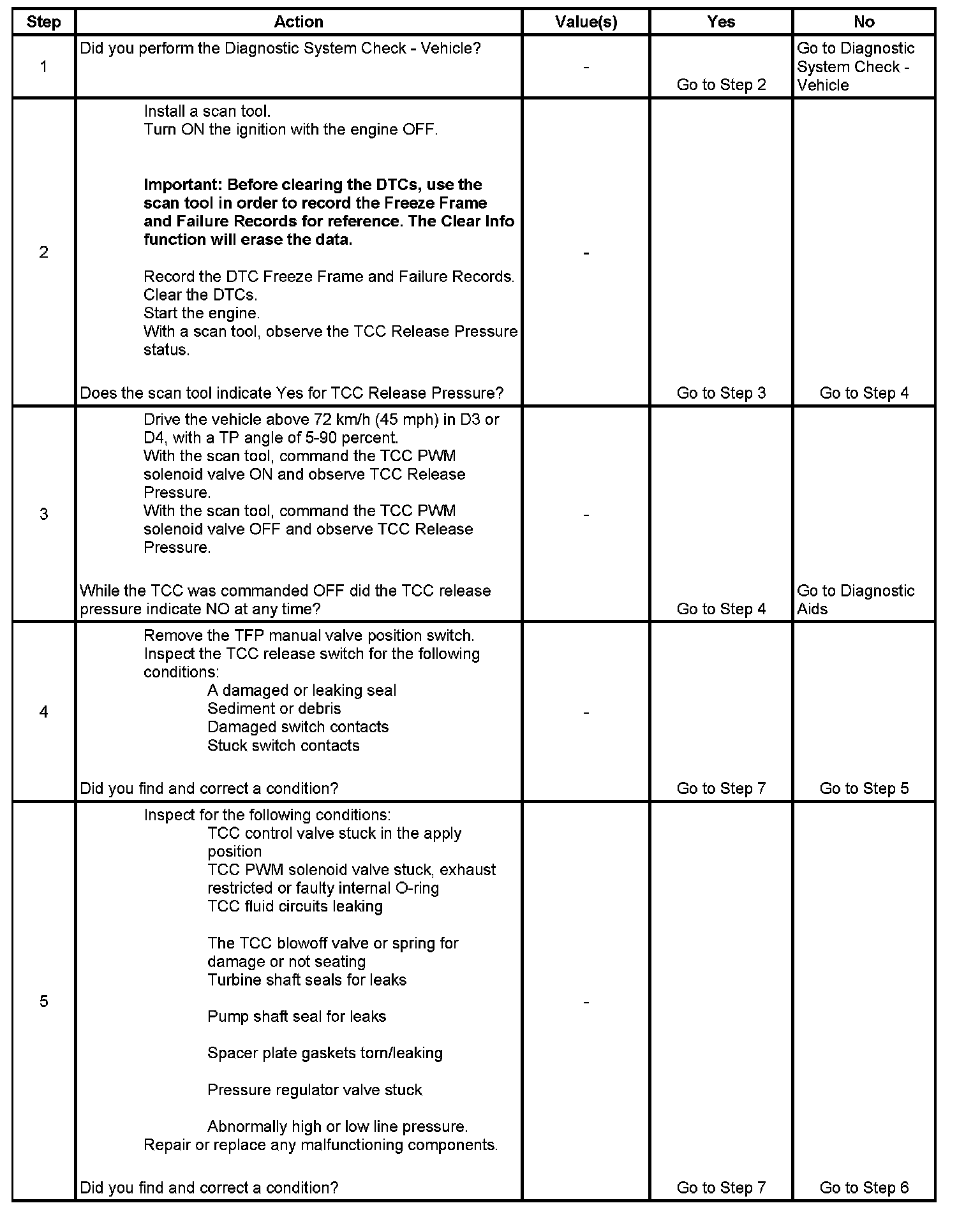 ^ If the scan tool indicated TCC release pressure was present in Step 2 and a mechanical or hydraulic condition was not found in Step 8, an intermittent short to ground condition may exist in the TCC release switch signal circuit. Refer to Testing for Intermittent Conditions and Poor Connections. Component Tests and General Diagnostics