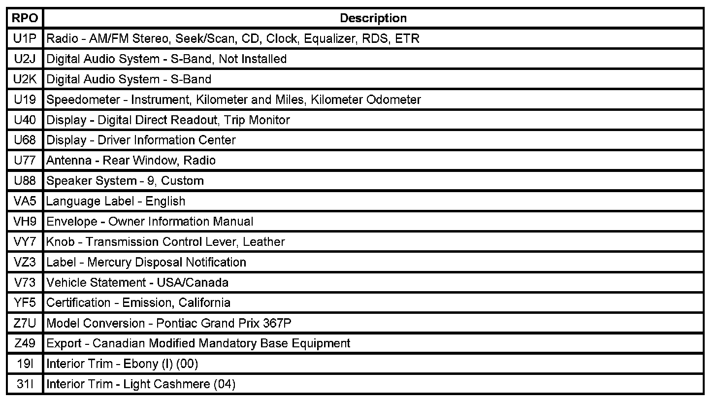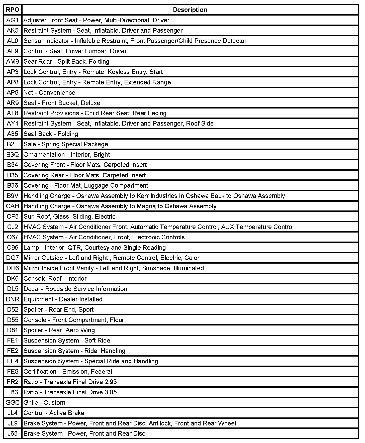 RPO Code List