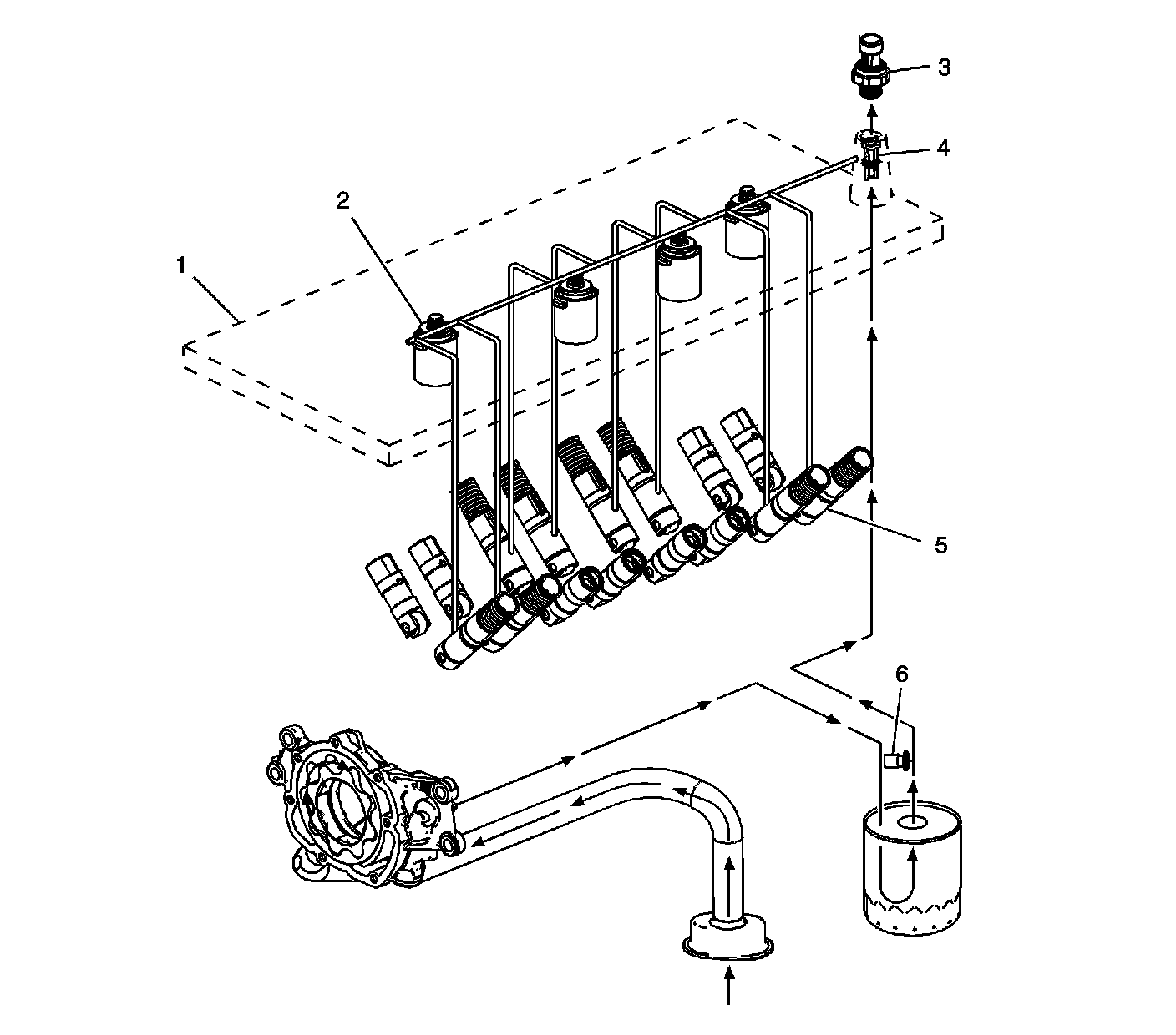 When the active fuel management system is commanded ON, the ECM will direct the solenoids of the oil manifold to open and direct pressurized oil to the valve lifters. Oil travels through the manifold and engine block oil galleries and enters the inlet port (6) of the valve lifter.