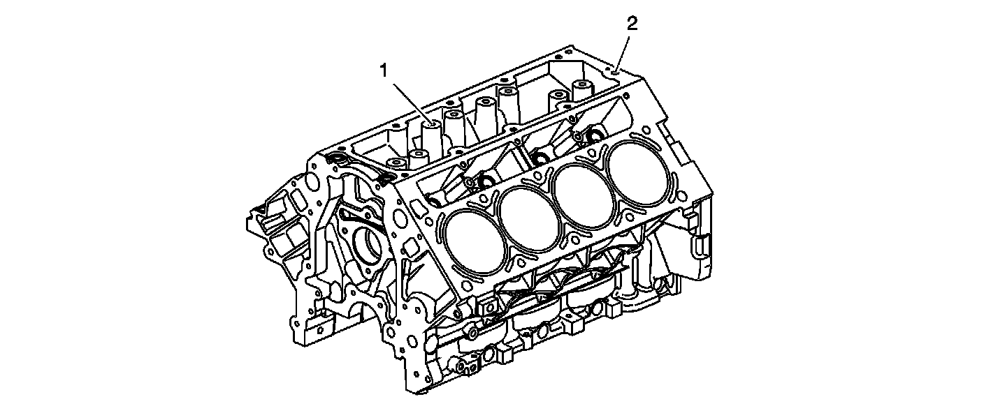 The active fuel management engine block incorporates additional features to support active fuel management system operation. Engine oil pressure is routed to the manifold assembly from an oil gallery (2) in the rear of the cylinder block. Cylinders 1, 4, 6, and 7 each have 2 vertical, cast-in-block oil passages (1). The vertical oil passages permit oil flow from the manifold assembly to the valve lifter bores.