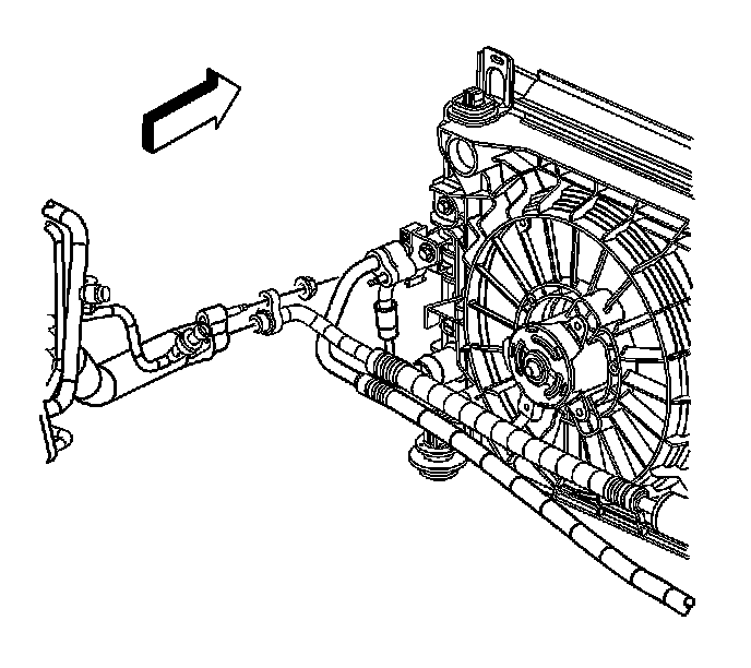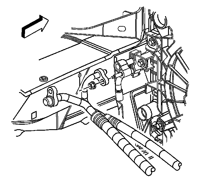 13. Remove the A/C compressor hose nut at the A/C receiver/dehydrator tube.