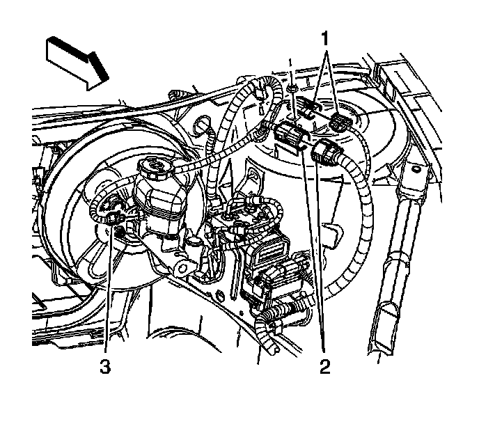 65. Connect the brake fluid level switch electrical connector (3) to the master cylinder.