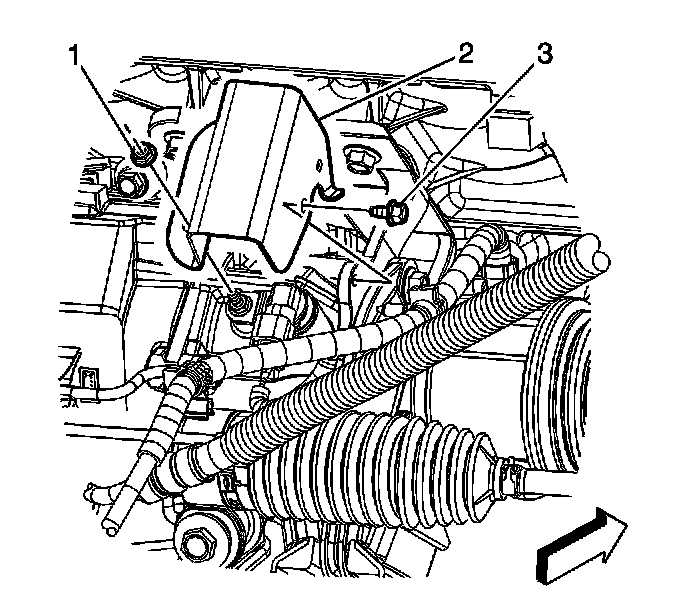 44. Remove the vehicle speed sensor (VSS) shield nut (1) and bolt (3). Remove the shield (2).