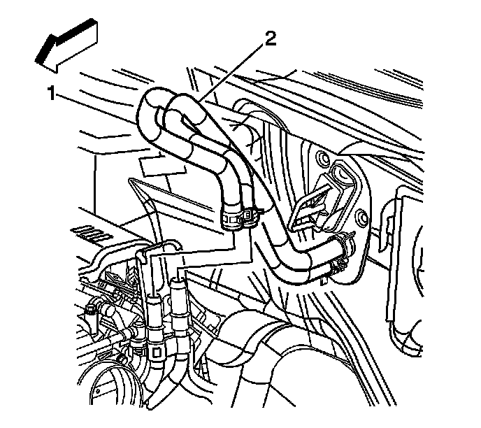 53. Remove the heater inlet (2) and outlet (1) hoses from the heater inlet/outlet pipe.
