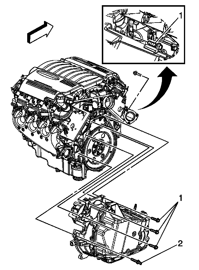 89. Remove the transaxle to engine bolts (1) and stud (2).