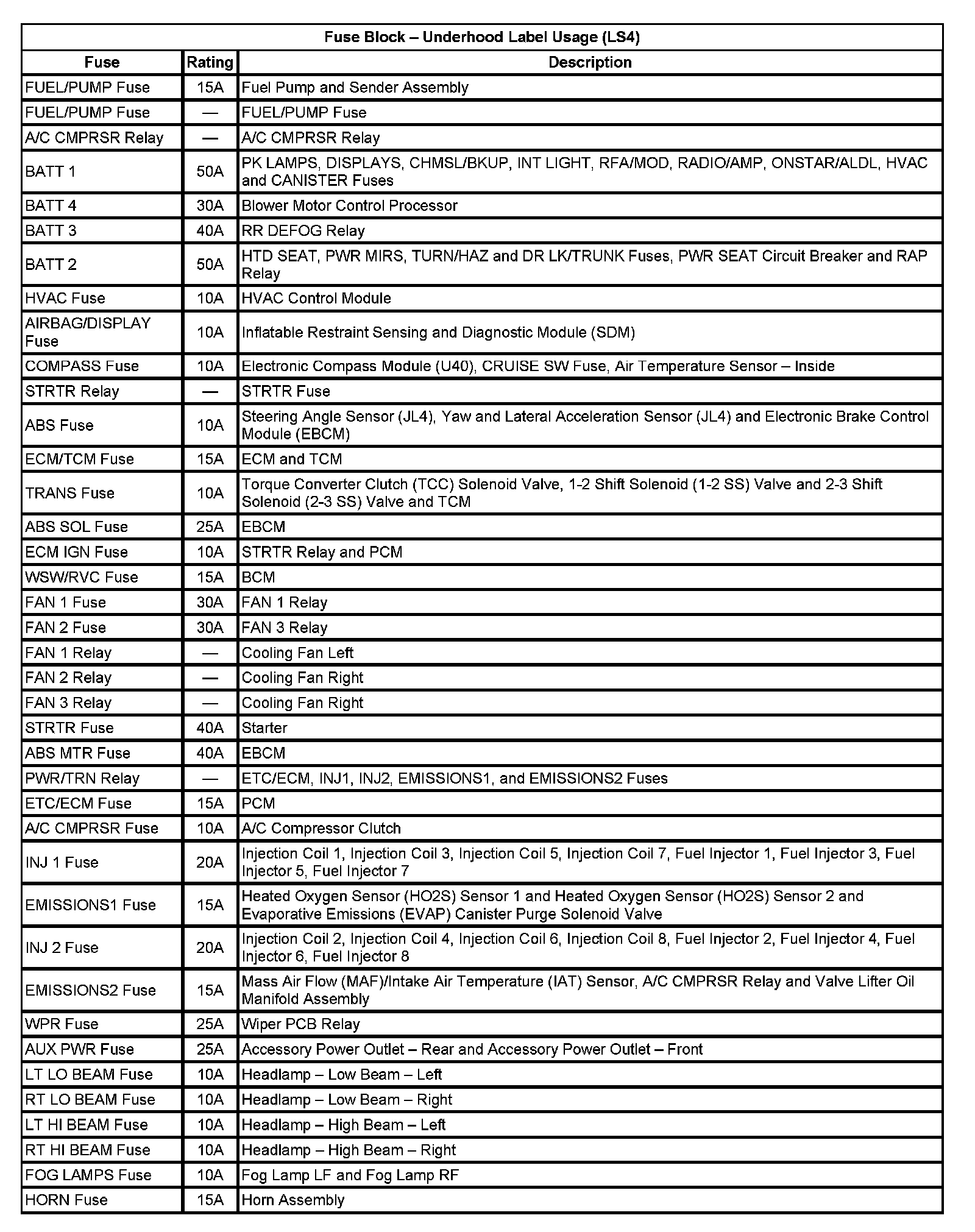 Fuse Block - Underhood Label Usage (With RPO Code LS4):