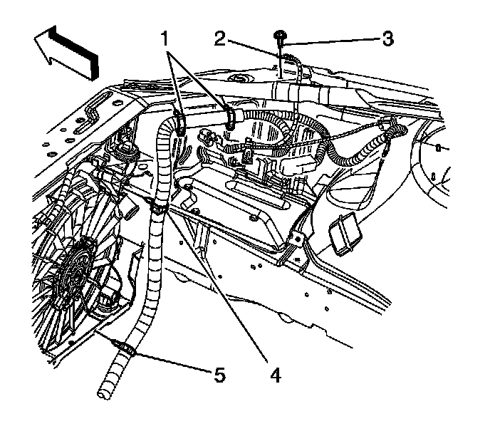 12. Remove the battery cable harness retaining clips (1, 4, and 5) from the front rail and fan shroud.