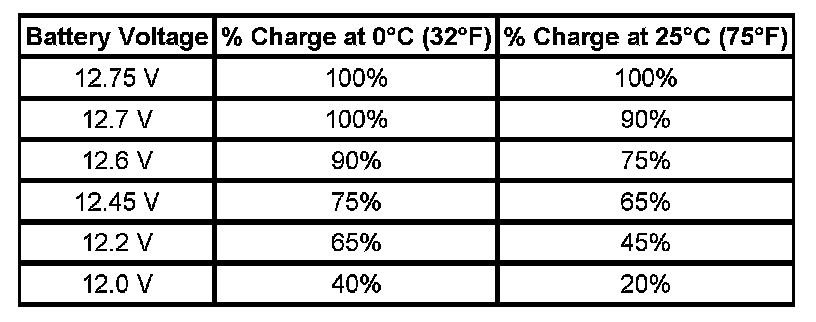 Important: Using voltage to determine the batteries state of charge (SOC) is only accurate after the battery has been at rest for 24 hours. This is enough time for the acid in each cell to equalize. If the battery has been charged or discharged in the past 24 hours, the battery SOC will only be an estimate.