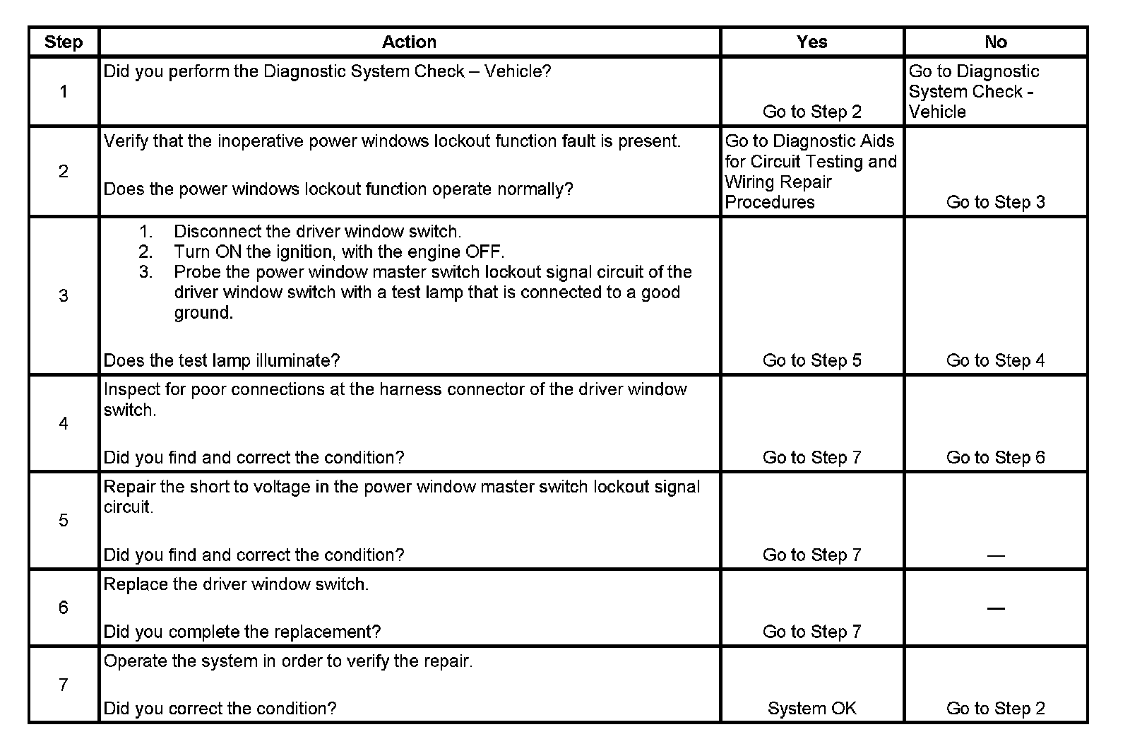 3. This step determines if the power window master switch lockout signal circuit may be shorted to battery positive voltage. Normally, with rear window lockout not enabled, this circuit is closed within the master window switch and rear windows are operational from their respective switches. When the lockout feature is enabled, the circuit is open and no voltage is available at the rear window switches. A short to voltage on this circuit would cause power to be supplied to the rear window switches regardless of the lockout switch status.
