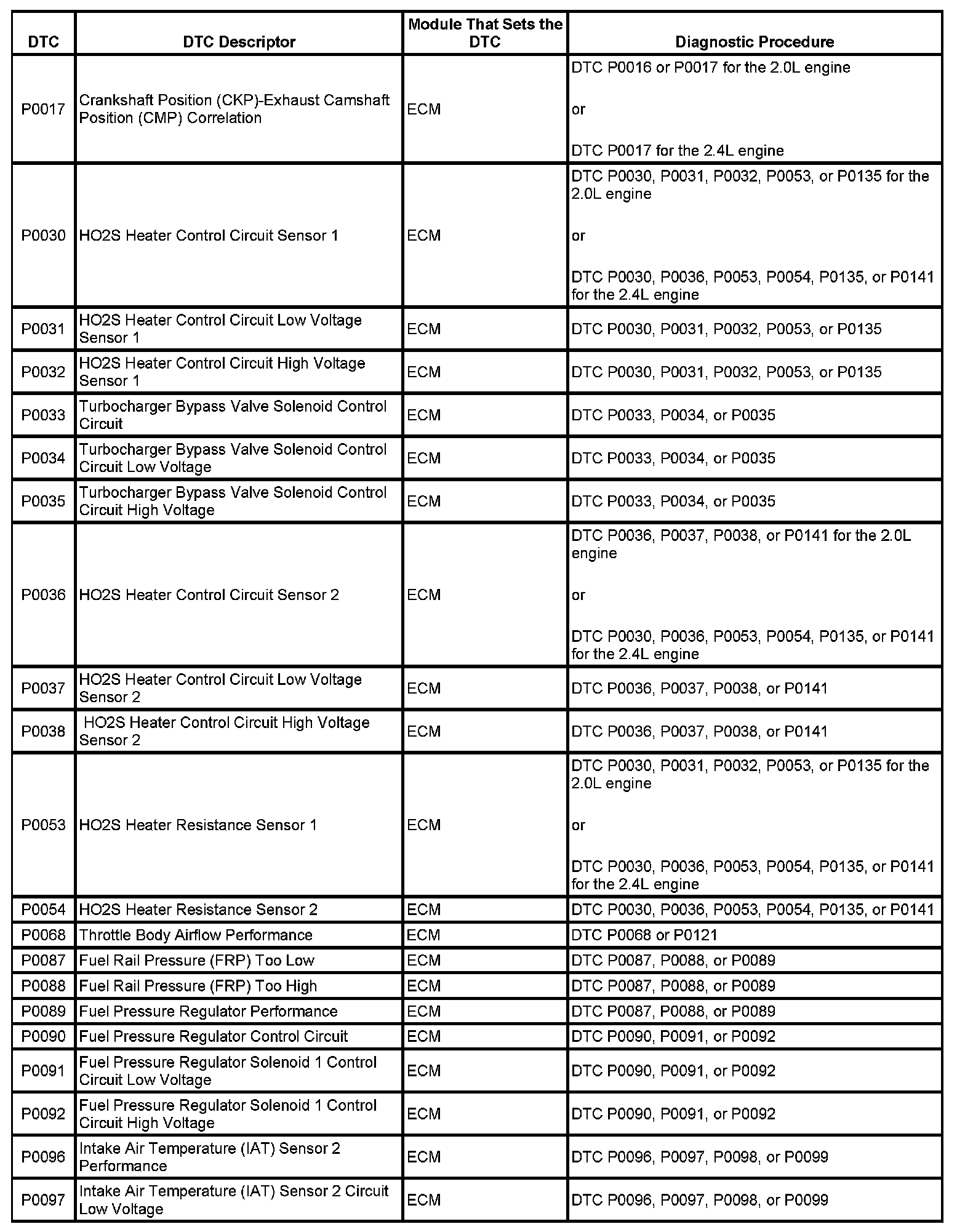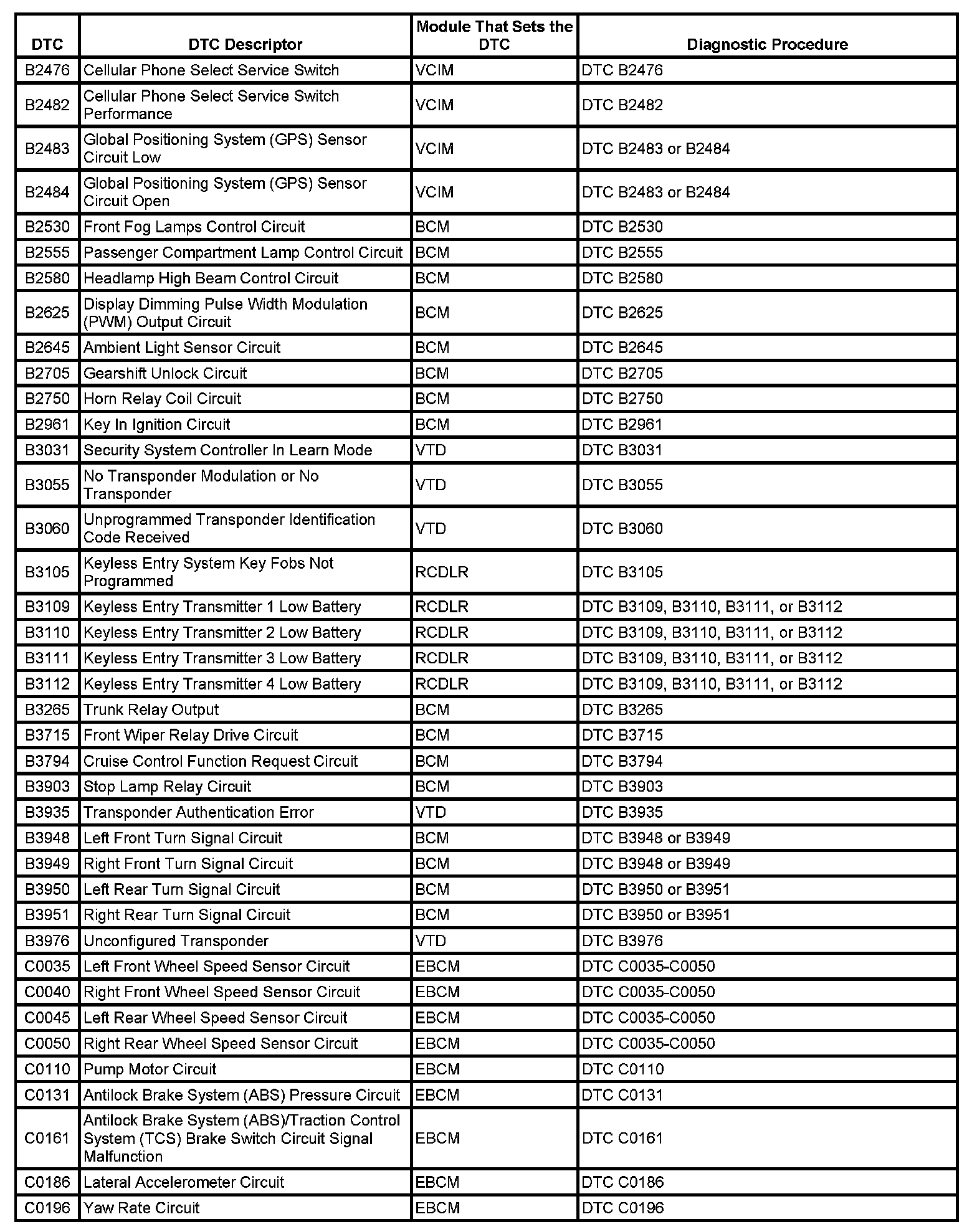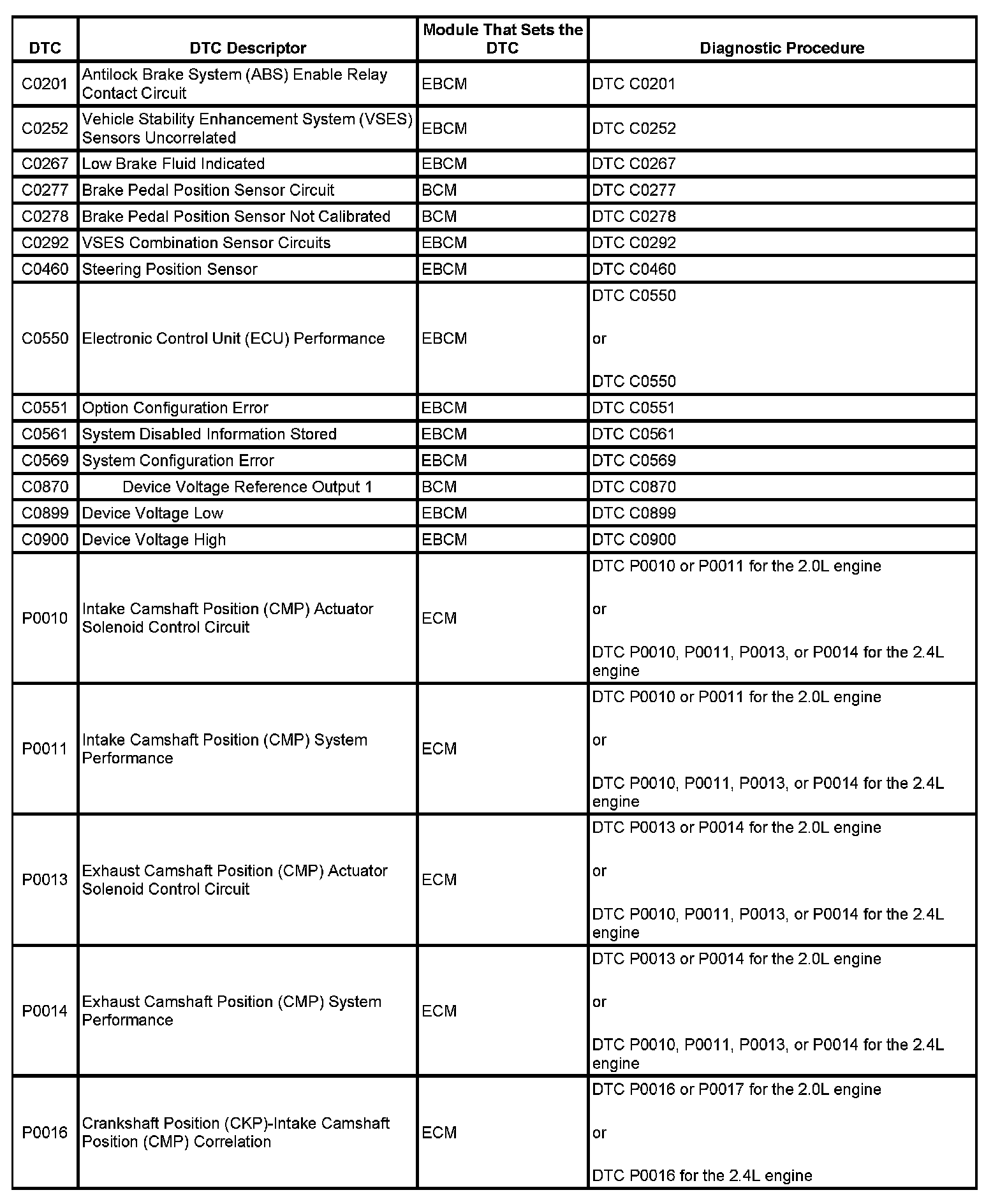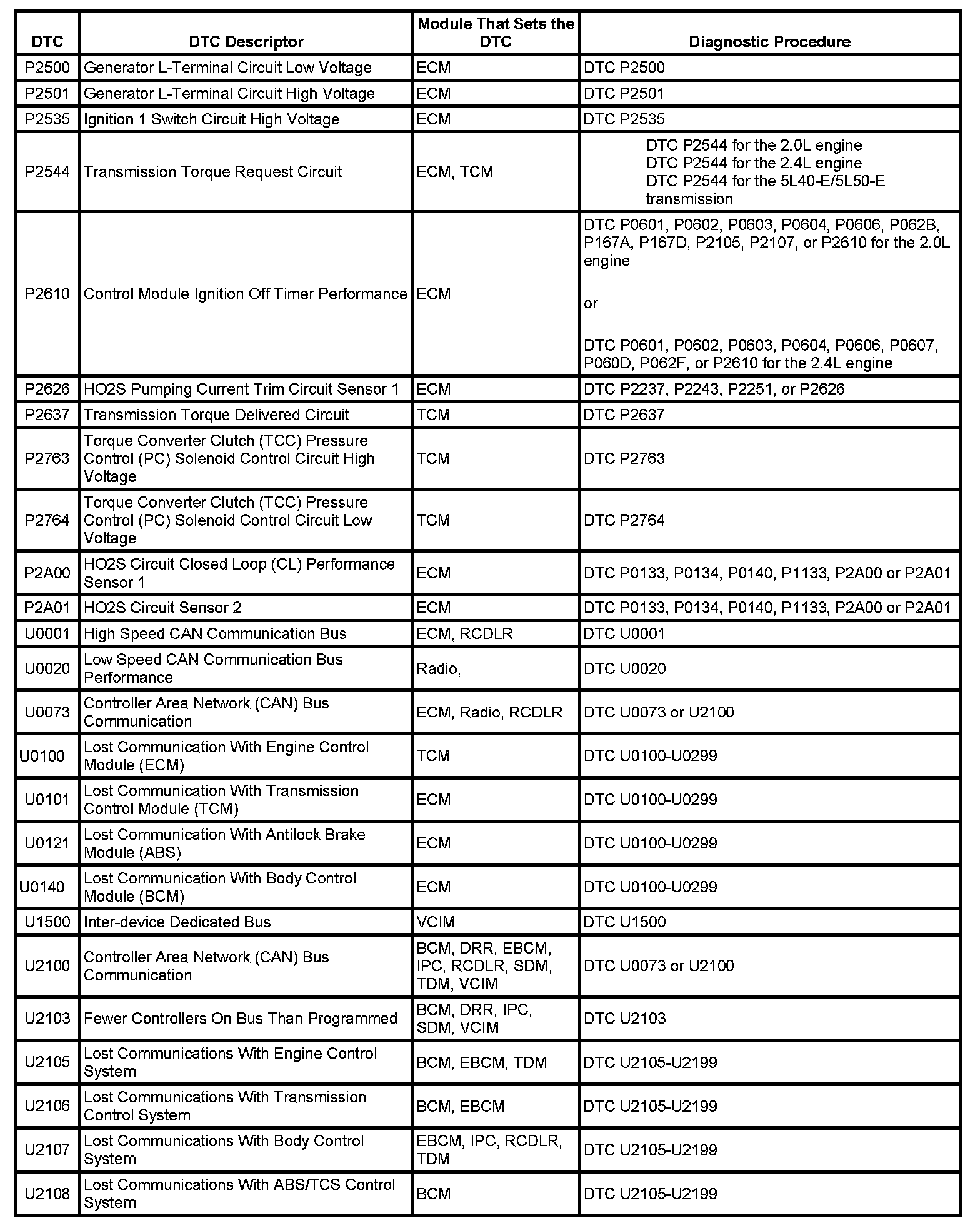 Diagnostic Trouble Code (DTC) List - VehicleThis master DTC list includes all applicable DTCs in alphanumeric order with descriptors.