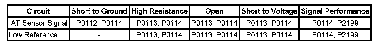 * Depending on the ambient temperature, an IAT sensor signal circuit that is shorted to the MAF sensor signal circuit can cause a DTC P0113 and/or a DTC P0114 to set. This condition may cause either a rapid fluctuation in the IAT Sensor parameter or cause it to become stuck at a given value.