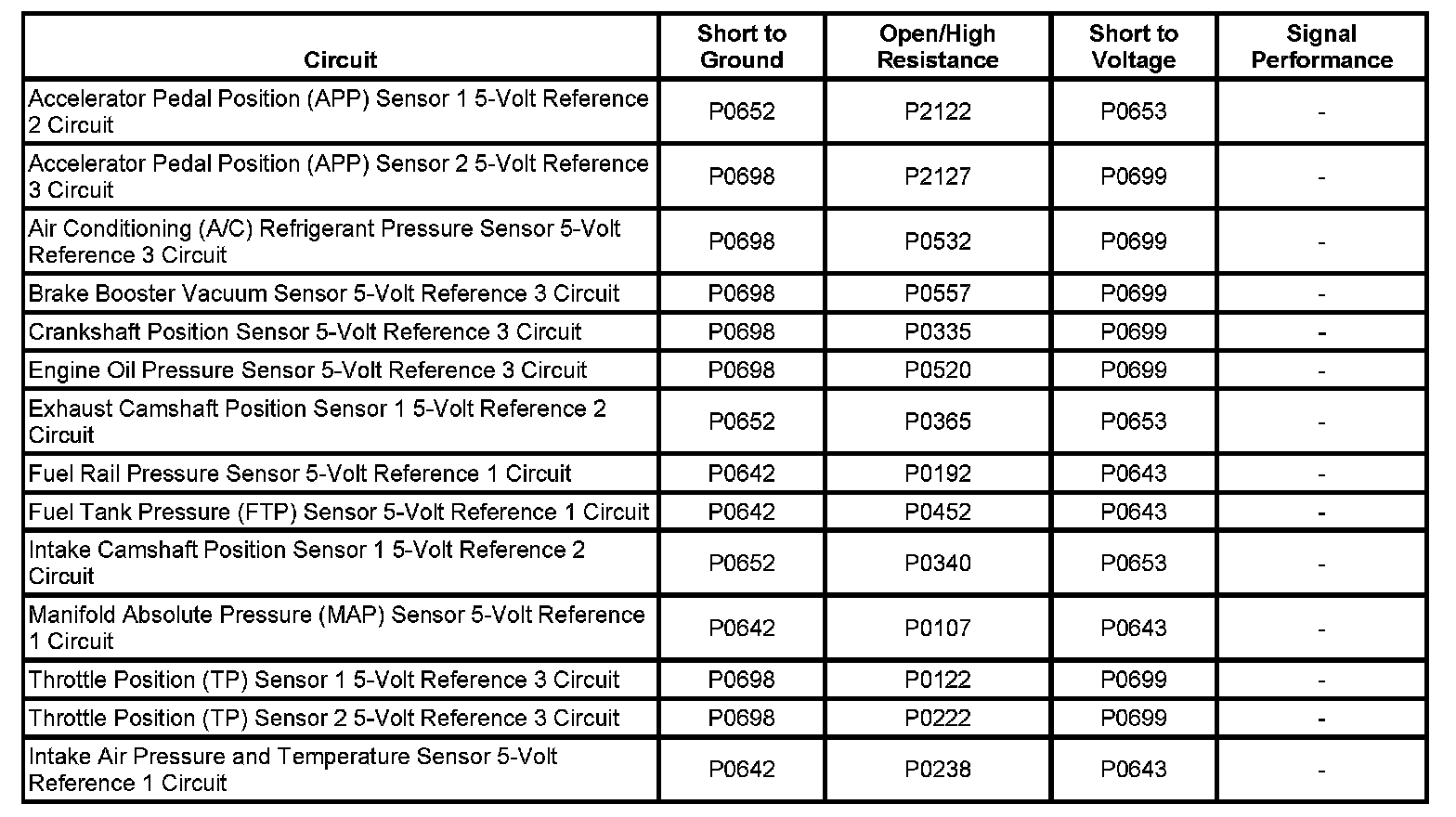 * DTCs P0642, P0652, and P0698 set when the ECM detects a low voltage condition on the 5-volt reference 1, 2, or 3 bus for more than 3 seconds.