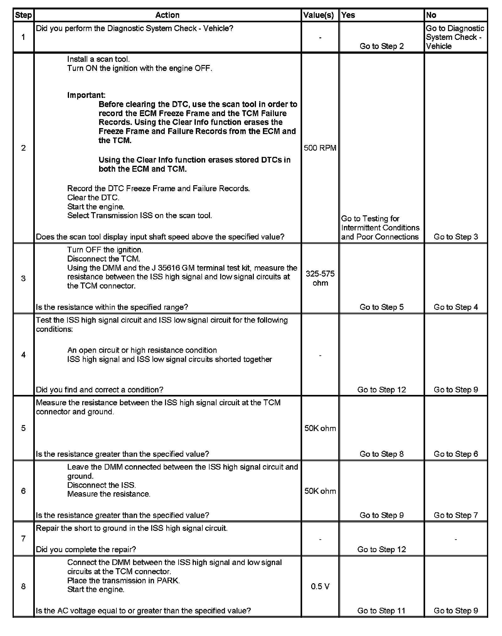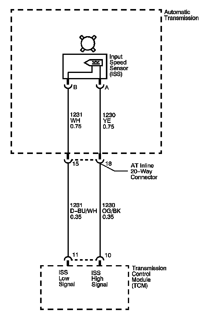3. The resistance measurement will not change if either the ISS high signal circuit or the ISS low signal circuit, but not both, is shorted to ground. The vehicle speed detector in the TCM and the ISS are matched in such a way that an open or a short to ground in the ISS low signal circuit will not usually cause a loss of speed signal or a DTC P0717 to set.