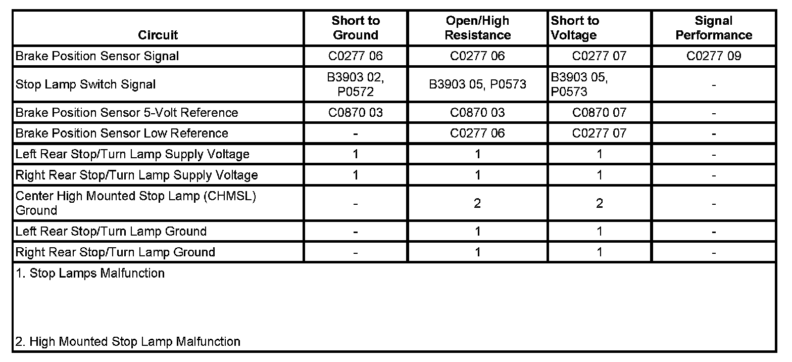 The brake pedal position sensor is used to sense the action of the driver application of the brake pedal. The brake pedal position sensor provides an analog voltage signal that will increase as the brake pedal is applied. The body control module (BCM) provides a low reference signal and a 5-volt reference voltage to the brake pedal position sensor. When the variable signal reaches a voltage threshold indicating the brakes have been applied, the BCM will apply battery positive voltage to the stop lamps, center high mounted stop lamp (CHMSL), transmission control module (TCM), and engine control module (ECM). The stop lamps will not operate unless the ignition is in the ON position. Ground for the left rear stop lamps is provided at G400. Ground for the right rear stop lamps is provided by G402.